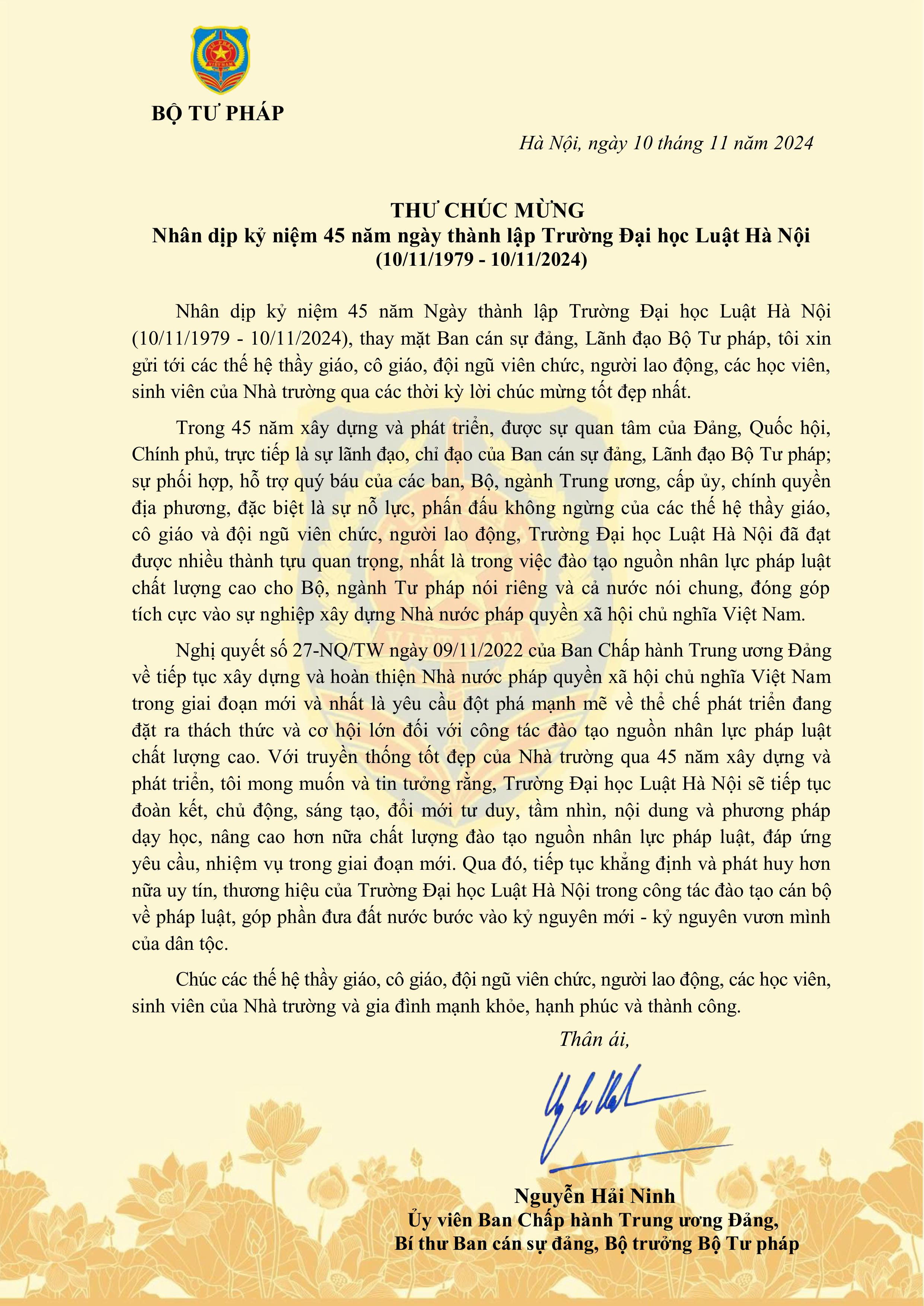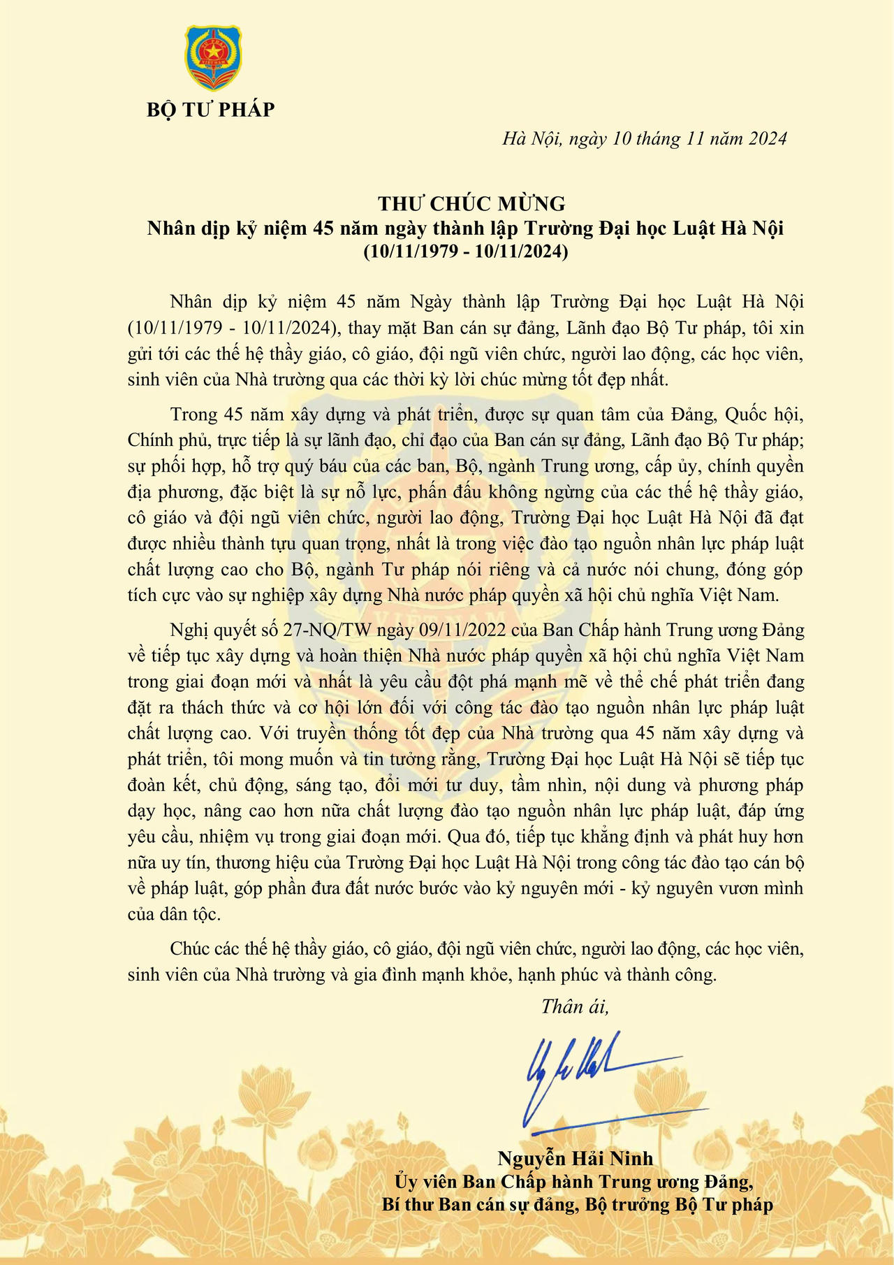 Thư chúc mừng của Bộ trưởng Bộ Tư pháp nhân dịp 45 năm thành lập Trường Đại học Luật Hà Nội