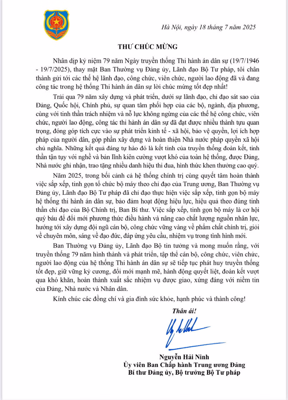 (PLVN) - Nhân dịp kỷ niệm 79 năm Ngày truyền thống Thi hành án dân sự (19/7/1946 - 19/7/2025), thay mặt Ban Thường vụ Đảng ủy, Lãnh đạo Bộ Tư pháp, Bộ trưởng Nguyễn Hải Ninh gửi Thư chúc mừng đến các thế hệ lãnh đạo, công chức, viên chức, người lao động đã và đang công tác trong hệ thống Thi hành án dân sự.