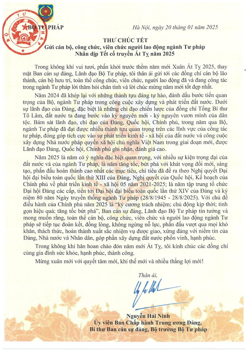Thư của Bộ trưởng Nguyễn Hải Ninh gửi CBCCVC, người lao động ngành Tư pháp nhân dịp Tết cổ truyền Ất Tỵ