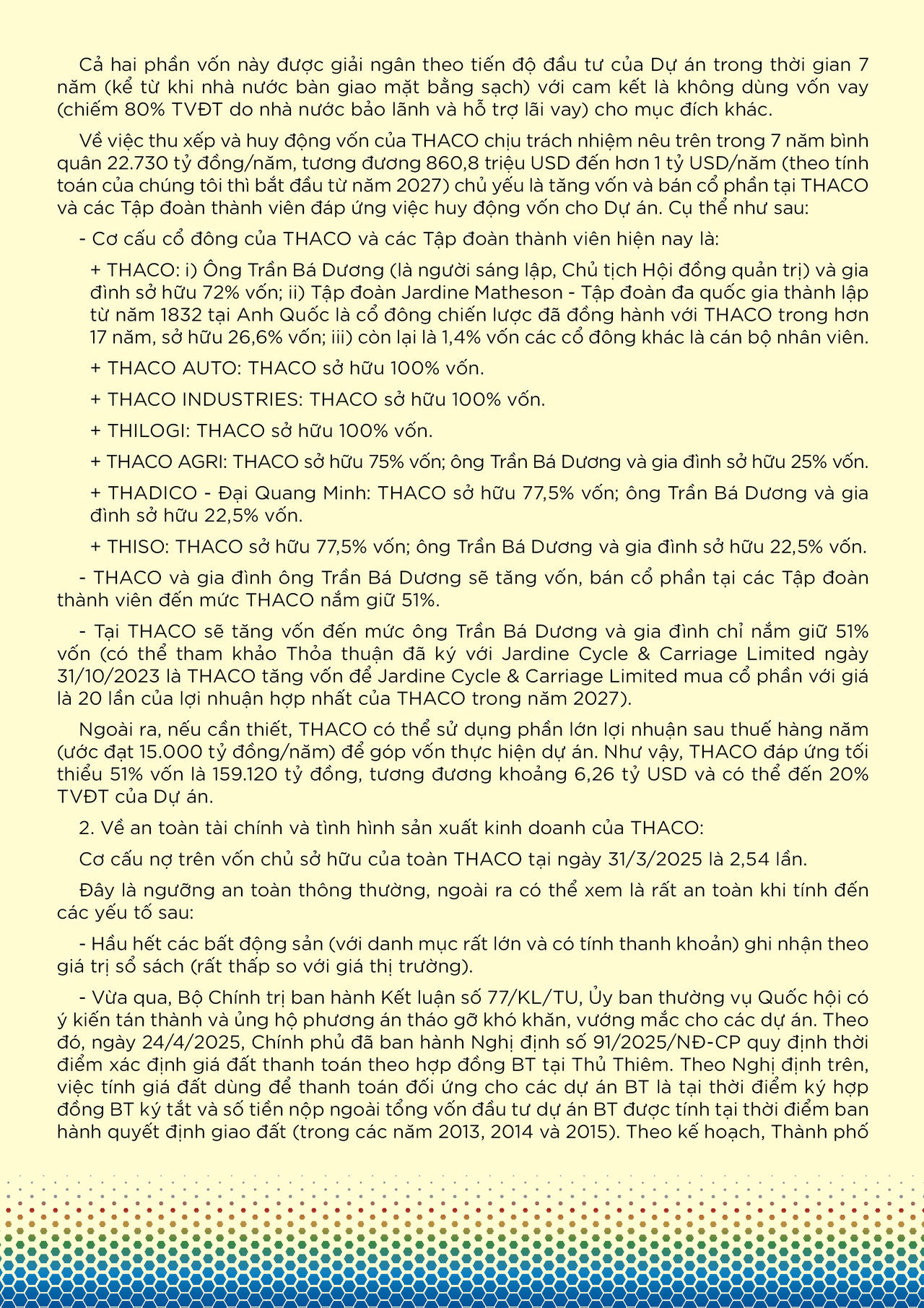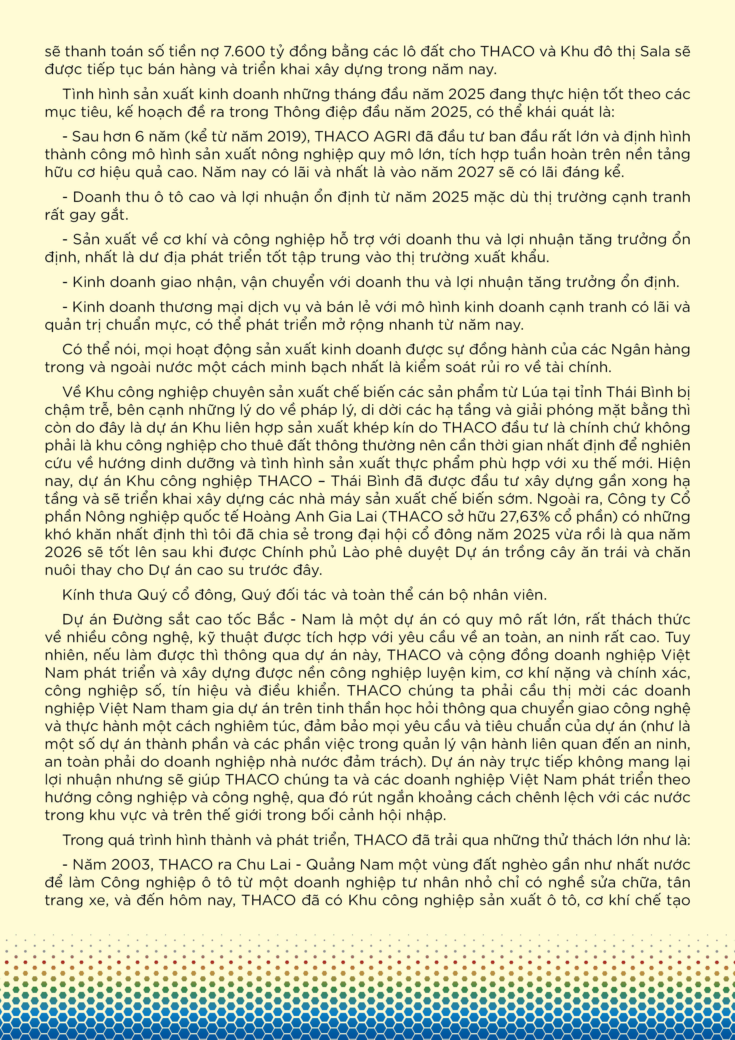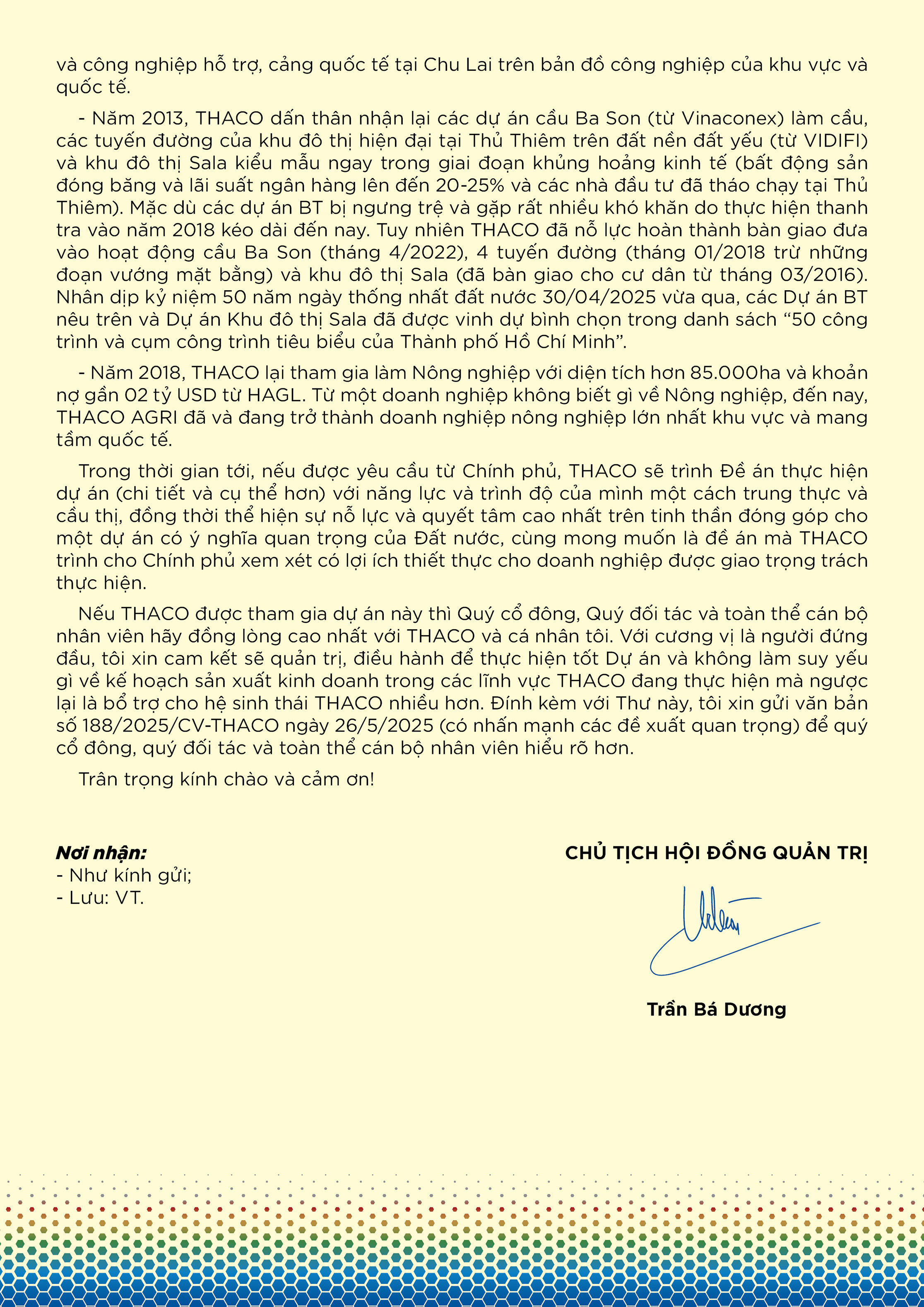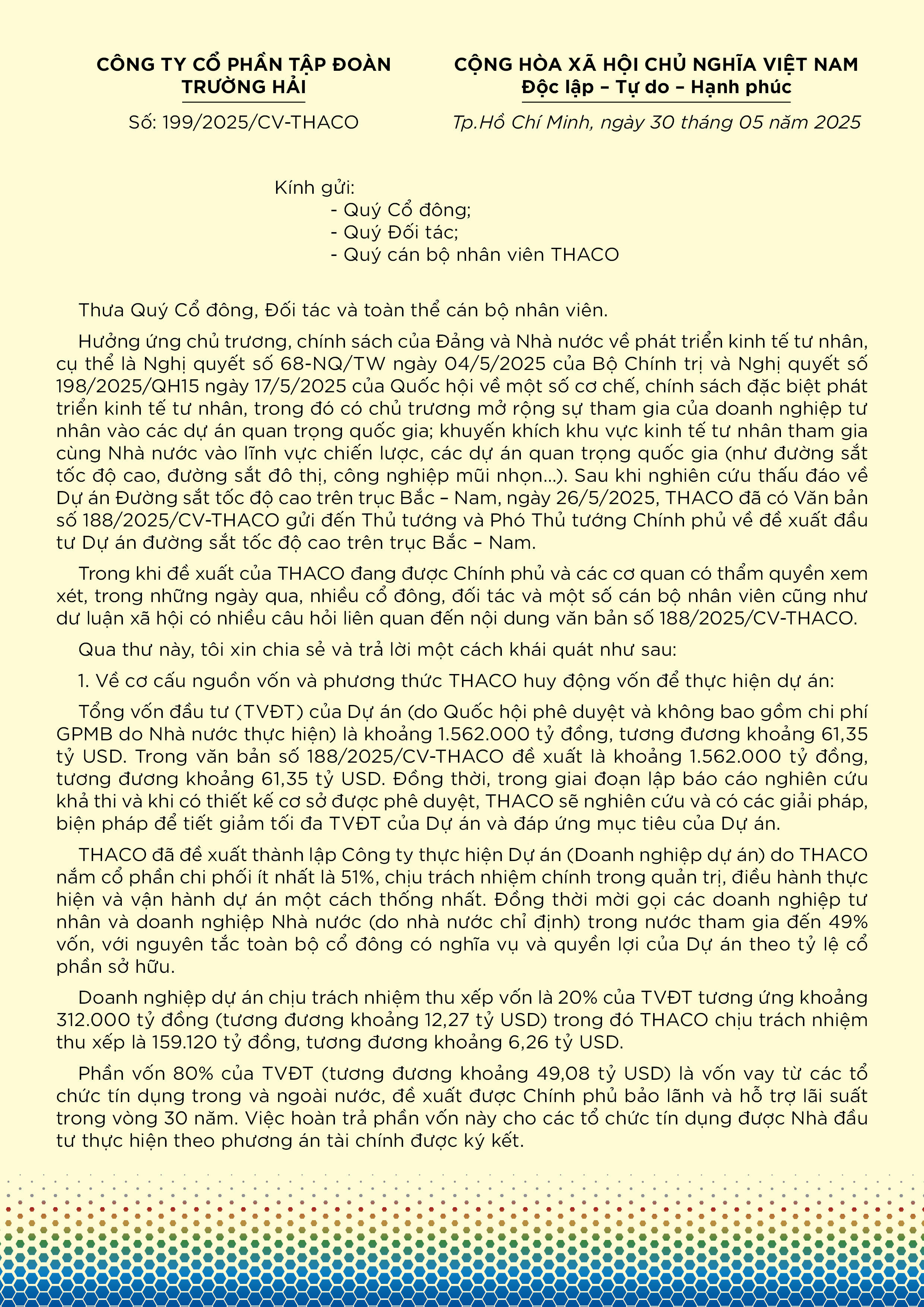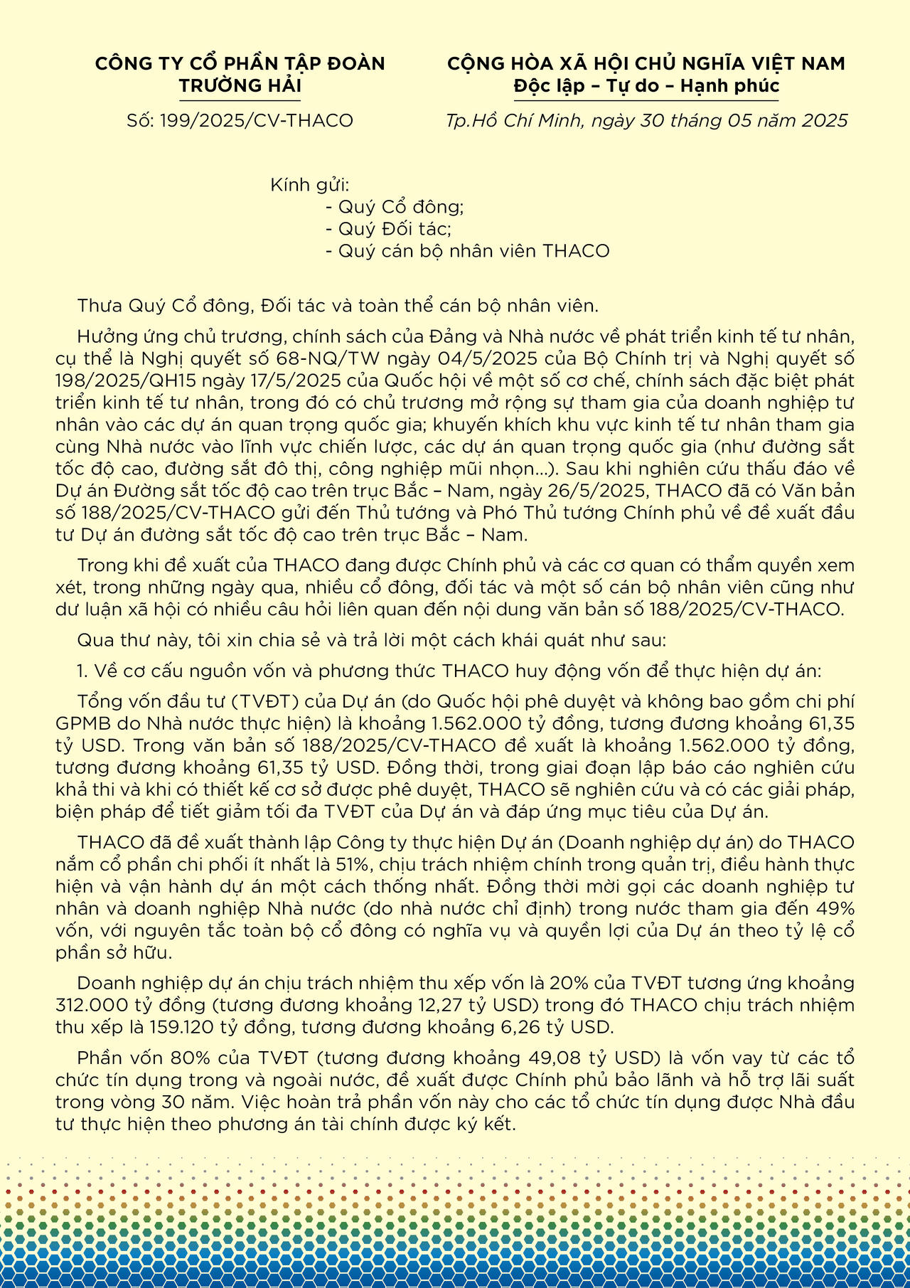 (PLVN) - Chủ tịch HĐQT THACO Trần Bá Dương đã có thư gửi các cổ đông, đối tác và cán bộ nhân viên về việc THACO đề xuất đầu tư Dự án Đường sắt tốc độ cao Bắc – Nam; thể hiện tinh thần trách nhiệm và quyết tâm của THACO trong việc tham gia các dự án trọng điểm quốc gia.