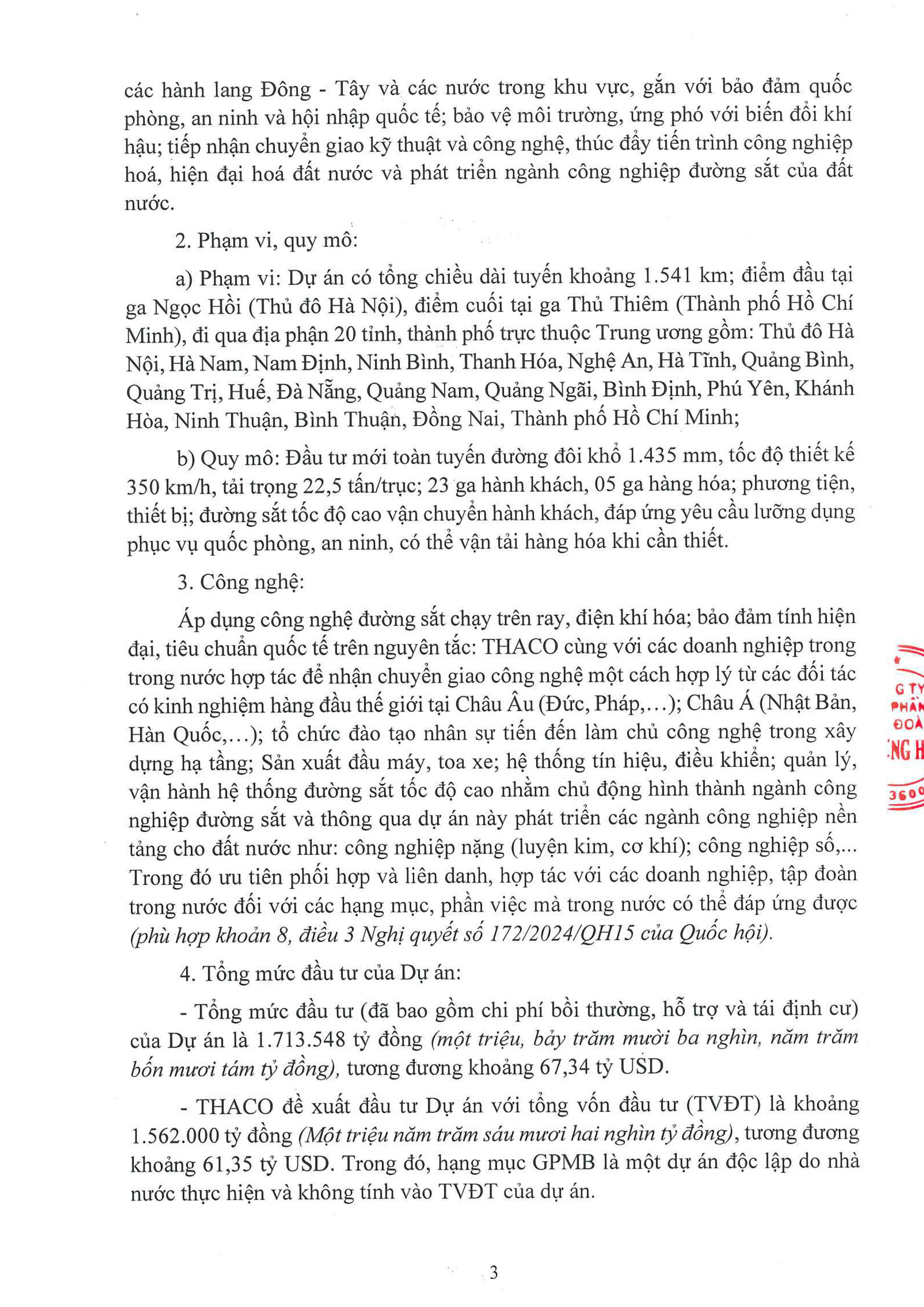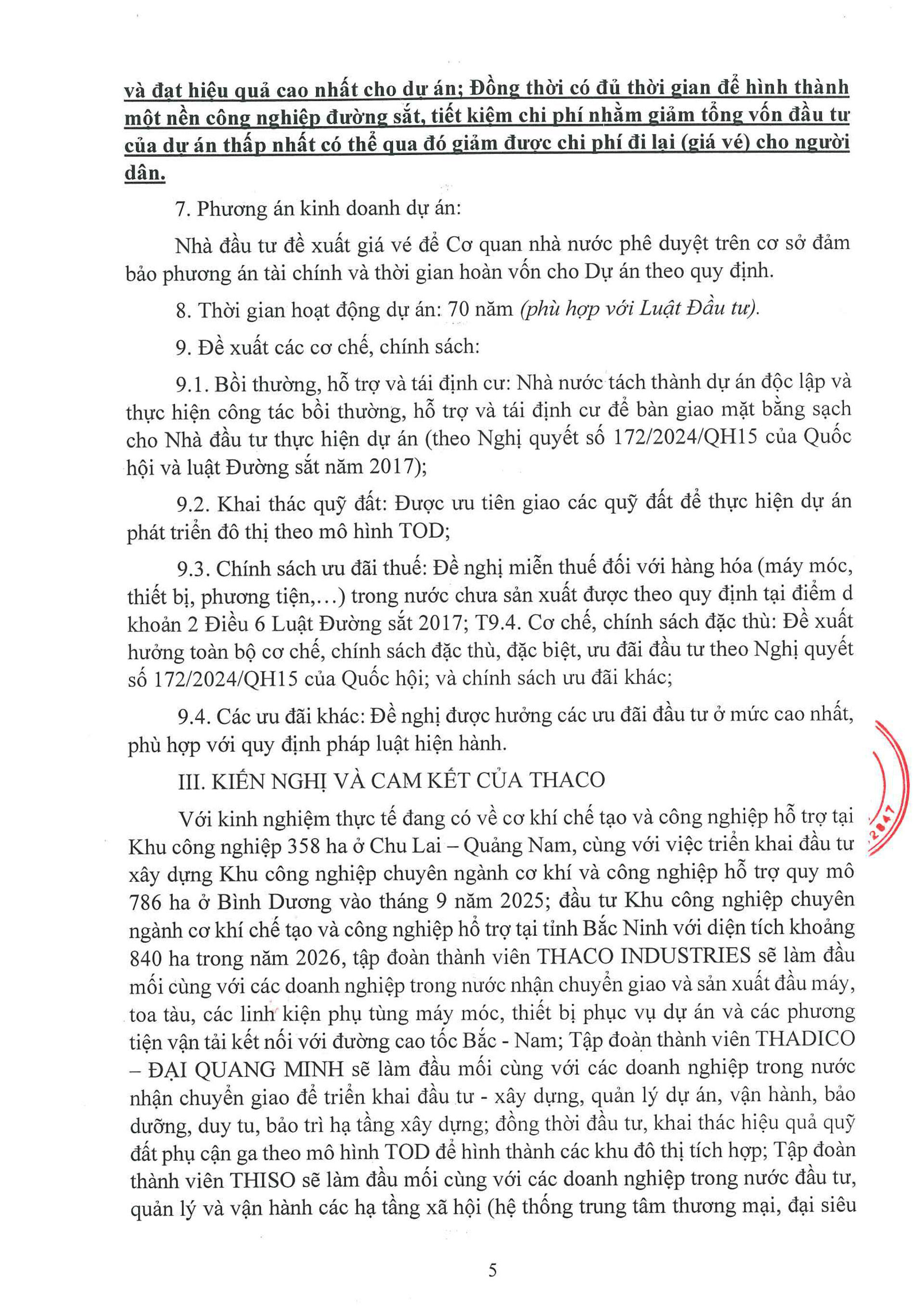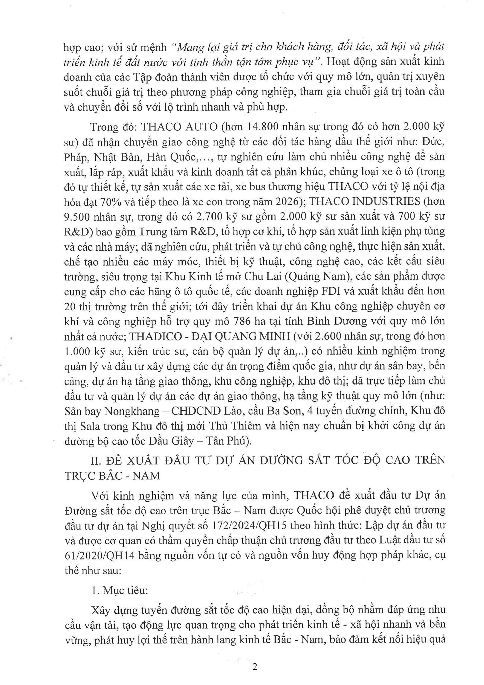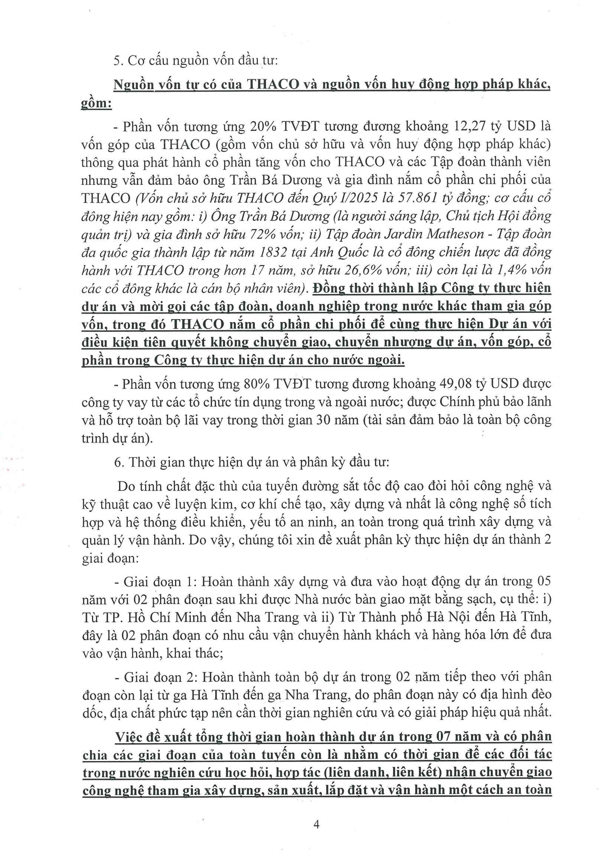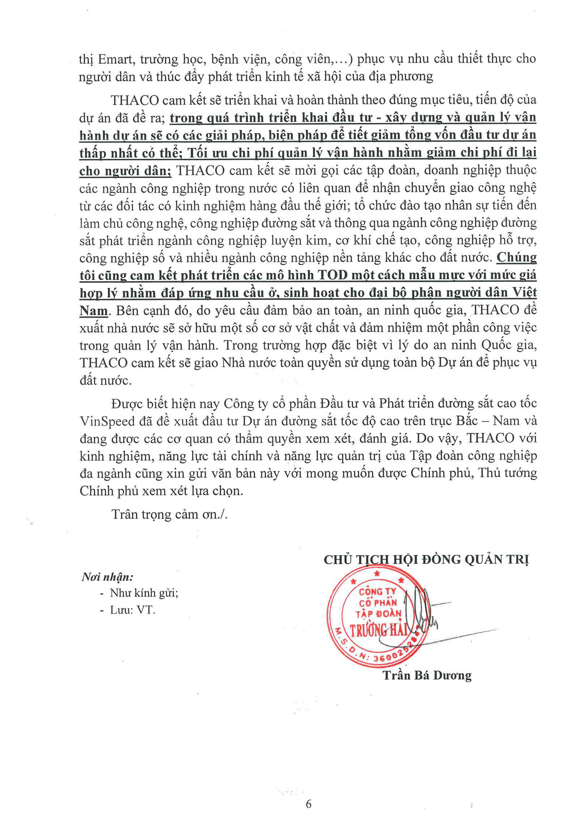 Thư của Chủ tịch Trần Bá Dương về việc THACO đề xuất đầu tư Dự án Đường sắt tốc độ cao Bắc – Nam