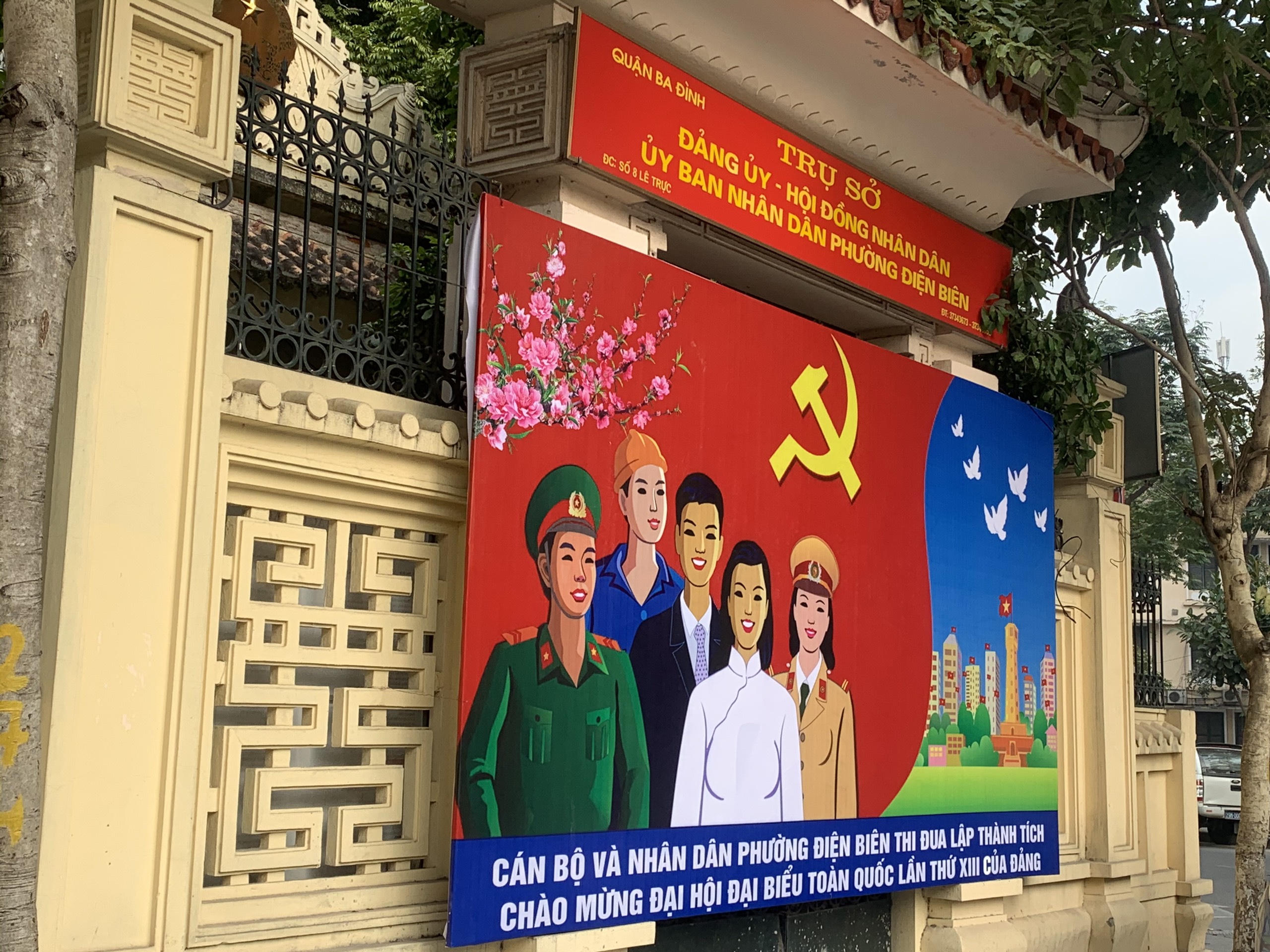 Tại phường Quán Thánh, nhiều khẩu hiệu tuyên truyền Đại hội XIII được trang trí rực rỡ.