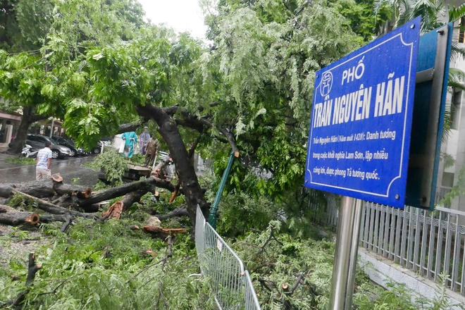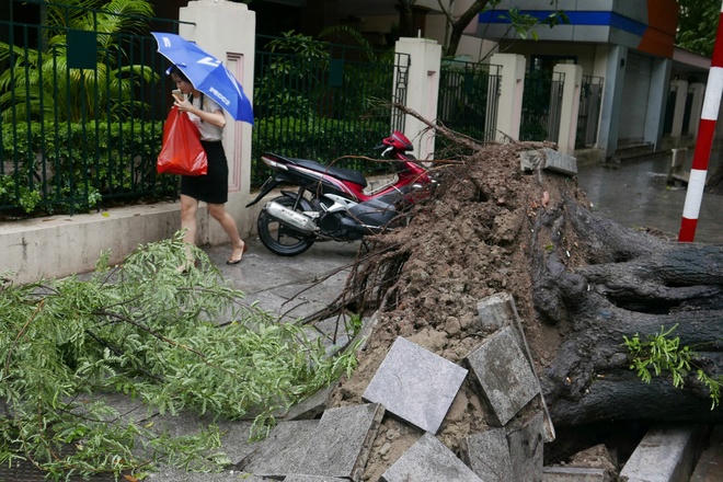 Trận mưa sáng nay cũng khiến cây me cổ thụ trên phố Trần Nguyên Hãn, đổ vào tường rào của UBND TP Hà Nội.