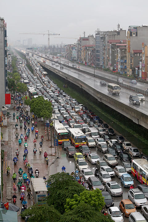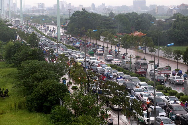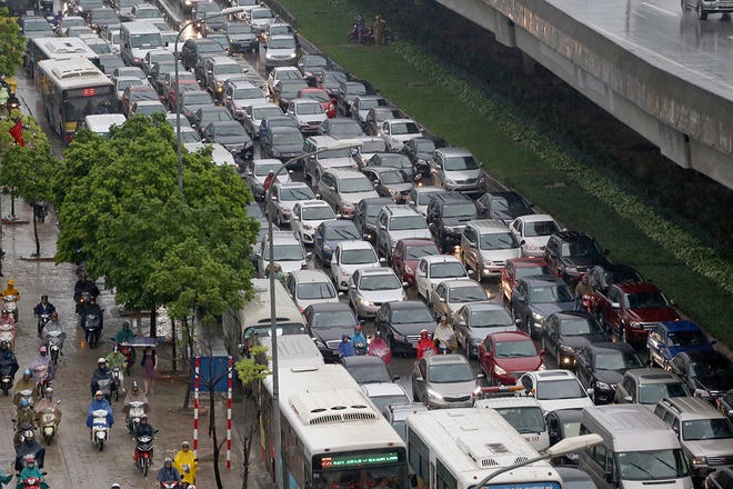 Đường ùn ứ kéo dài tới gần một km, từ đoạn gần cổng Đại học Thăng Long đến nút giao Nguyễn Trãi, hàng nghìn phương tiện phải chôn chân dưới mưa. Hàng nghìn ôtô từ các hướng đường trên cao đổ xuống và từ phía Nam của thủ đô dồn về nút giao này.