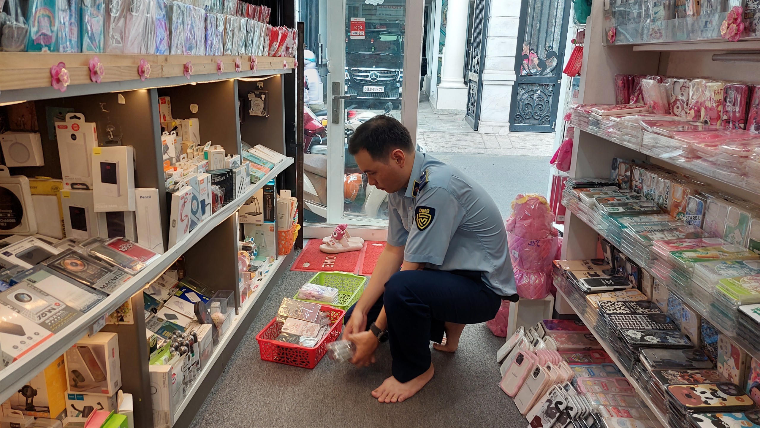 Kiểm tra điểm kinh doanh phụ kiện điện thoại trên đường Đinh Công Tráng, Đội đã phối hợp với Công an phường Tân Định, quận 1 phát hiện trên 100 đơn vị sản phẩm ốp lưng điện thoại có dấu hiệu giả mạo các nhãn hiệu Apple, Chanel, Louis Vuitton... Chủ hộ kinh doanh cho biết, tất cả các sản phẩm đều mua trôi nổi trên thị trường và không có hóa đơn chứng từ chứng minh nguồn gốc hàng hóa.