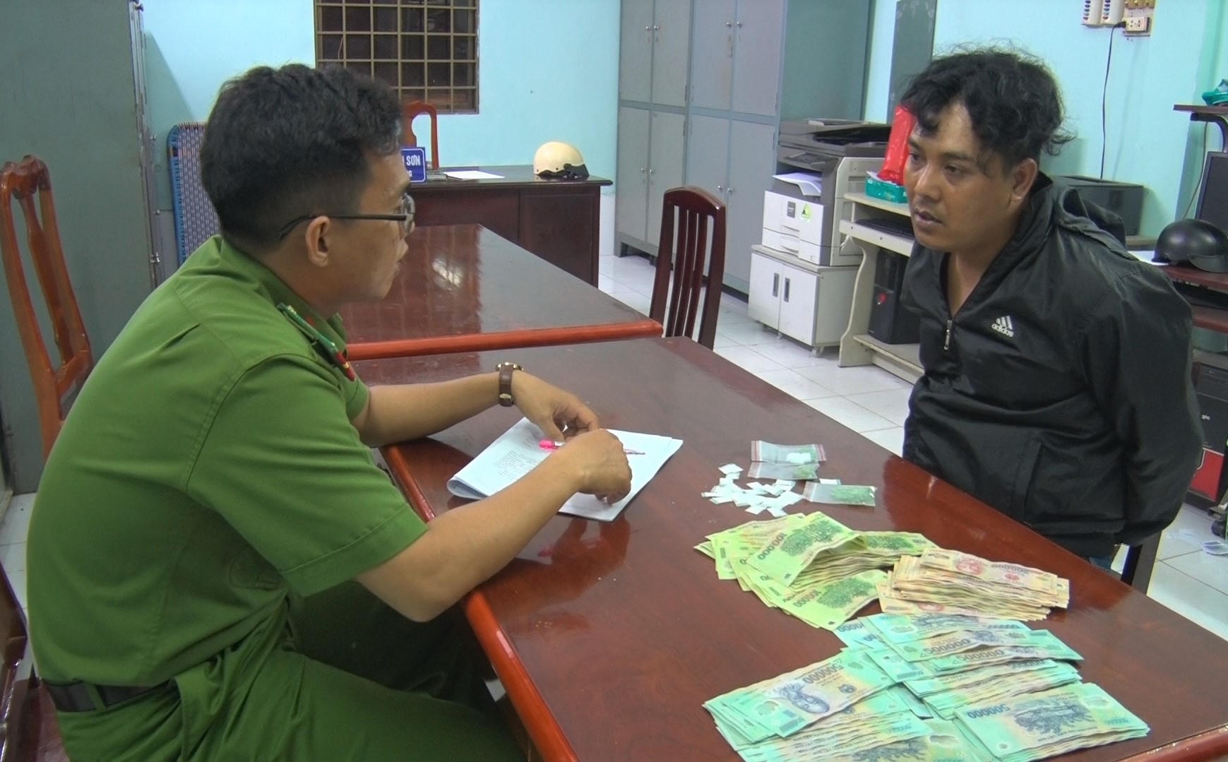 Qua khám xét đối tượng Hoàng và nơi ở tại phòng trọ của đối tượng, Công an thu giữ 53 viên thuốc lắc, 27 bịch nylon bên trong có chứa ma túy đá, 1 xe máy, 1 điện thoại di động và gần 80 triệu đồng.