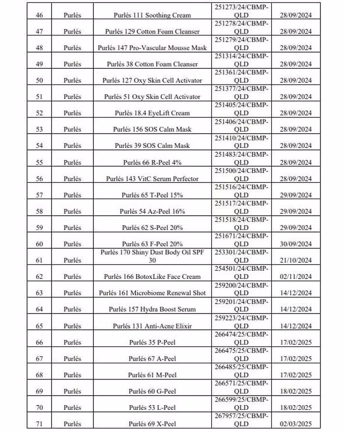 Danh mục sản phẩm bị thu hồi thuộc nhiều nhóm mỹ phẩm khác nhau như chăm sóc da, trang điểm, làm sạch, chống nắng và một số sản phẩm chuyên dụng, với thời gian được cấp số tiếp nhận trong giai đoạn từ năm 2022 đến năm 2025.