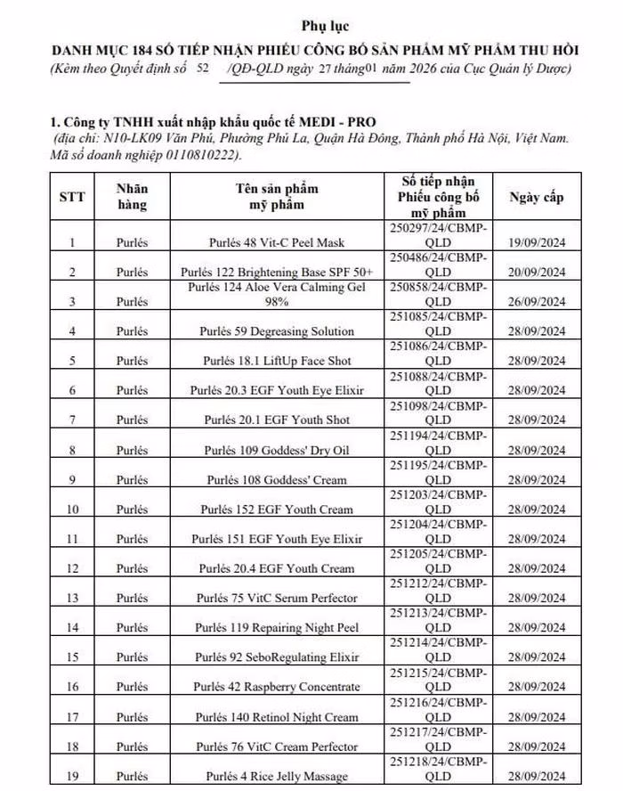 Danh mục 184 số tiếp nhận phiếu công bố sản phẩm mỹ phẩm bị thu hồi kèm theo Quyết định số 52/QĐ-QLD.