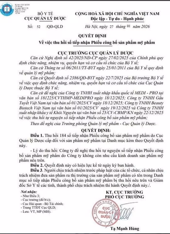 Theo Cục Quản lý Dược, việc thu hồi được thực hiện căn cứ Nghị định số 42/2025/NĐ-CP của Chính phủ, Thông tư số 06/2011/TT-BYT của Bộ Y tế về quản lý mỹ phẩm và các quy định pháp luật liên quan đến chức năng, nhiệm vụ của Cục.