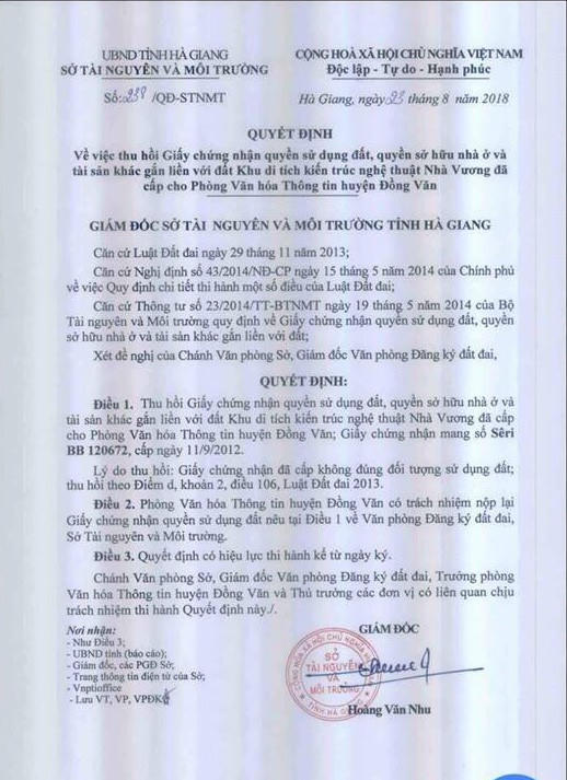 Ngày 23/8, Sở Tài nguyên và Môi trường tỉnh Hà Giang có quyết địnhsố 238/QĐ-STNMT, thu hồi giấy chứng nhận quyền sử dụng đất, quyền sở hữu nhà ở và tài sản khác gắn liền với đất khu dinh thự họ Vương
