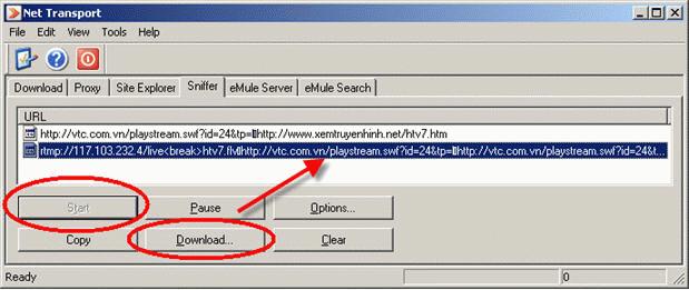Khi đã chụp bắt được đường liên kết, bạn bấm chuột trên đường dẫn đó trong danh sách mà Sniffer tìm thấy và đưa ra, sau đó bấm nút Download. Đường dẫn đã chọn sẽ tự động được đưa vào mục tải tập tin mới. Bạn cần phải chỉnh số lượng Thread về giá trị 1. Đây là tham số của chương trình Net Transport cho phép cắt tập tin cần tải thành nhiều phần để nạp về cùng một lúc. Nhưng do khi tải kênh truyền hình theo chế độ trực tuyến, chúng ta không hề có kích thước cuối cùng của tập tin, và cũng không thể cắt nhỏ dòng video thành nhiều phần để tải cùng lúc được. Kế đến trong mục Start, bạn cũng chọn một trong ba kiểu Instant (tải ngay lập tức), Manually (tải khi người dùng ra lệnh), và Schedule (tải theo thời gian biểu). Bạn cũng đừng quên chọn lại thư mục chứa tập tin lưu trữ trong mục Directory bằng cách bấm vào nút Browse. Lưu ý rằng thư mục và đĩa cứng được chọn phải còn đủ dung lượng để chứa toàn bộ nội dung mà bạn định lưu xuống.