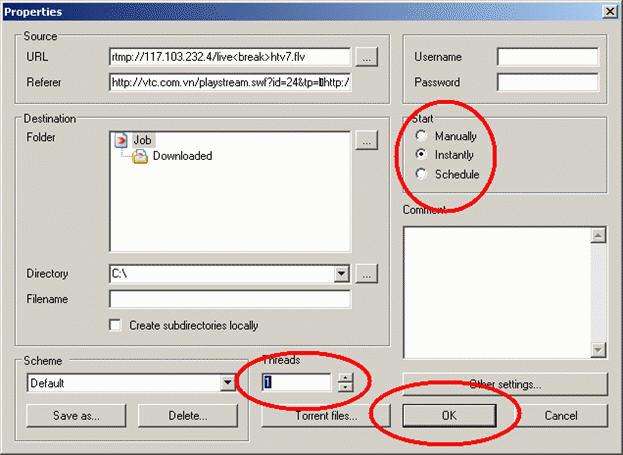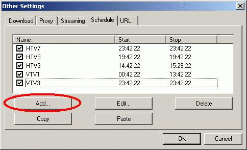 Giải pháp cho việc này là bạn chuyển cách bắt đầu tải sang chế độ định giờ, bằng cách bấm phải chuột trên đường liên kết rồi chọn Properties. Sau đó bạn chuyển chế độ Start từ Manually sang Schedule, và bấm tiếp nút Other Settings. Trong thẻ Schedule, bạn bấm nút Add để thêm vào một thời biểu ghi hình mới.