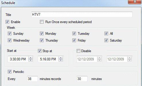 Quan trọng nhất là mục Start at, là thời điểm bắt đầu ghi chương trình truyền hình, và Stop at, là thời điểm ngừng ghi hình. Nếu bạn muốn ghi liên tục cho đến khi bạn tiến hành dừng nó bằng tay, thì bạn có thể tắt dấu chọn trong mục Stop at đi. Nếu có một khoảng thời gian nào đó mà bạn không muốn lịch biểu này hoạt động, thì bạn đánh dấu mục Disable, rồi chọn ngày bắt đầu cũng như ngày kết thúc giai đoạn đó.