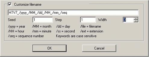 Cấu hình mục này sẽ tự động tạo ra các tập tin mới theo cách mà chúng ta định dạng. Ví dụ muốn tên tập tin sẽ bao gồm tên kênh truyền hình là HTV7, theo sau là các giá trị năm, tháng, ngày, giờ, phút tại thời điểm tạo lập tập tin, và kèm sau đó là một chuỗi số tăng dần, ta nhập vào chuỗi sau: HTV7_/yyyy_/MM_/dd_/HH_/mm_/seq.