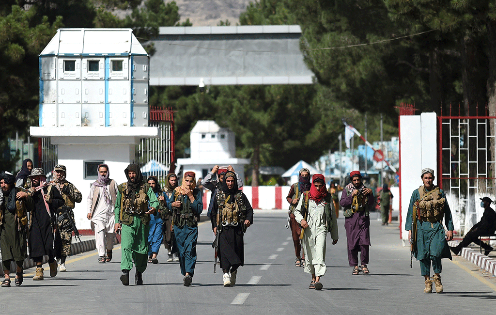 Các chiến binh Taliban đi bộ tại cổng chính của sân bay quốc tế ở Kabul ngày 28/8/2021, sau khi Taliban tiếp quản Afghanistan. Ảnh: AFP |