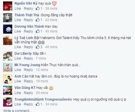 Sau một thời gian nghỉ ngơi ở những tháng đầu của thai kỳ, Thu Minh đã trở lại với các sân khấu ca nhạc. Cô xuất hiện trên sân khấu với váy vàng nổi bật dài chấm gót chân và trình diễn ca khúc Love của nhạc sĩ Thanh Bùi. Dù đang mang thai và hát live trực tiếp nhưng Thu Minh trình bày khá tốt ca khúc này với chất giọng dày, khỏe khiến cư dân mạng không ngớt lời khen dành cho nữ ca sĩ ngay bên dưới fanpage của Vietnam’s Got Talent.