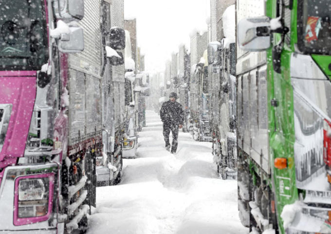 Hàng dài xe tải nối đuôi nhau trên tuyến cao tốc Shin-meishin ở thành phố Suzuka, tỉnh Mie, ngày 25/1. Ảnh: AFP.