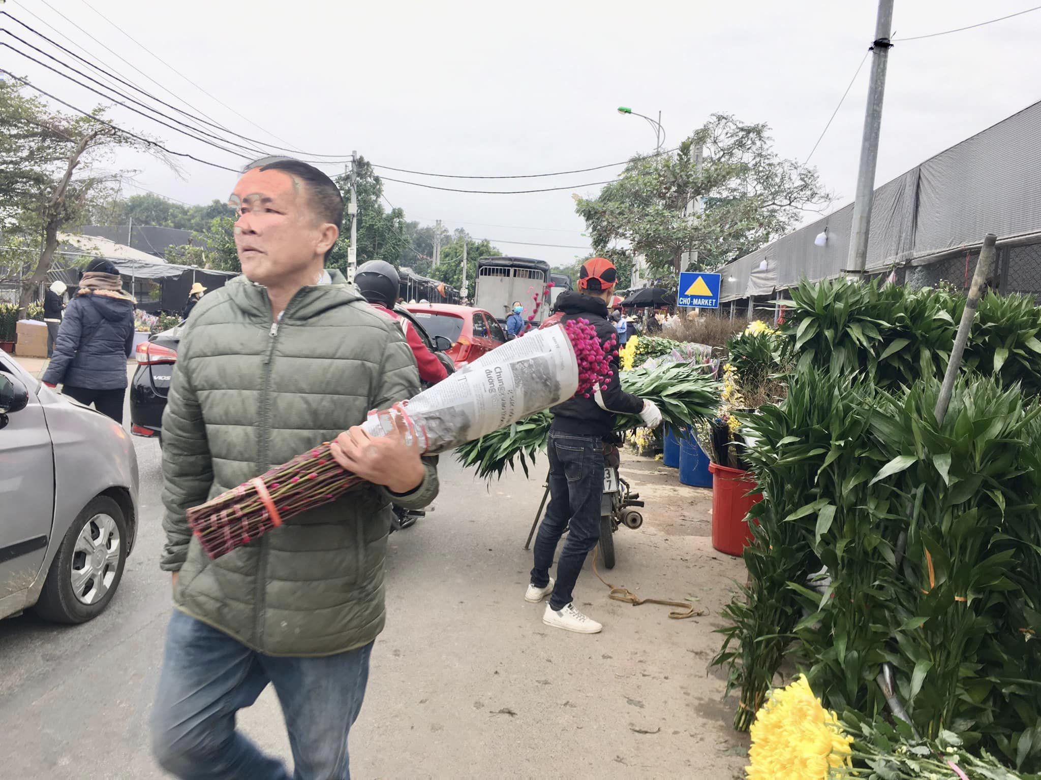 Dọc con đường đến chợ hoa Mê Linh, hàng trăm xe ô tô của các thương lái và người dân khắp nơi đến thu mua, thăm quan.