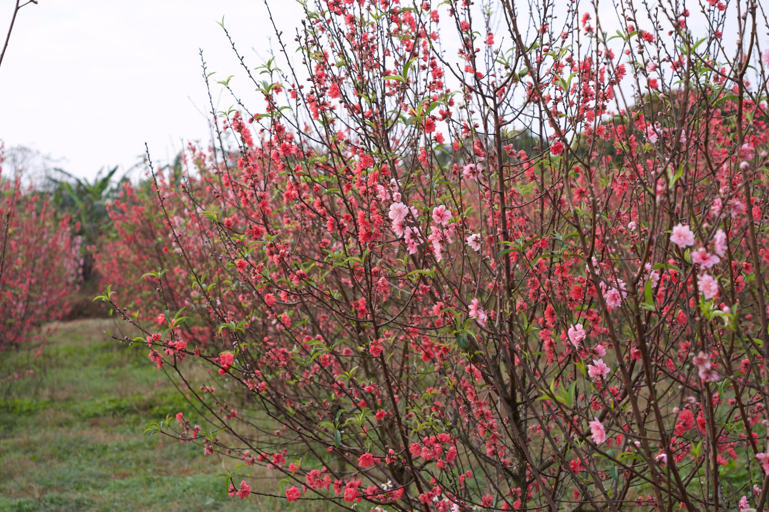 Gắn bó với nghề trồng hoa hơn 30 năm, vụ hoa Tết này gia đình ông Nguyễn Hữu Khiều xuống giống trên diện tích 5 sào (khoảng 2.500 m²), trong đó có khoảng 500 gốc đào. Theo ông Khiều, thời điểm gieo trồng gặp mưa nhiều khiến tỷ lệ cây sống chỉ đạt khoảng 70%, buộc gia đình phải trồng dặm để bảo đảm sản lượng. Khi cây vừa ổn định thì thời tiết lại chuyển nắng ấm kéo dài, khiến phần lớn diện tích đào bung nở sớm từ đầu tháng Chạp. Đào khó bán đúng dịp Tết, gia đình ông tận dụng mở vườn cho người dân tham quan, chụp ảnh nhằm có thêm nguồn thu bù đắp chi phí chăm sóc.