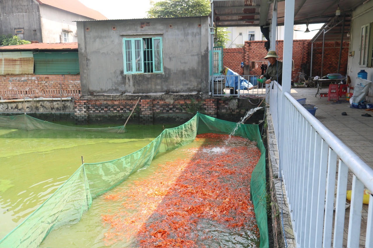 Cũng theo bà Hương, mỗi hộ nuôi cá đều có những bí quyết riêng để chăm sóc cá, từ cách cho ăn đến việc thay nước. Thức ăn cho cá chủ yếu là cám, rau xanh và các loại thức ăn bổ sung khác. Việc cho cá ăn đúng cách không chỉ giúp cá phát triển tốt mà còn đảm bảo chất lượng cá khi đến tay người tiêu dùng. Mùa thu hoạch cá chép đỏ diễn ra vào khoảng giữa tháng Chạp, khi cá đã đạt kích thước phù hợp cho việc cúng ông Công ông Táo. Trong quá trình thu hoạch, người dân sử dụng lưới để bắt cá, sau đó cho cá vào các thùng chứa. Những con cá chép đỏ được chọn lựa kỹ lưỡng, đảm bảo rằng chúng có màu sắc đẹp và khỏe mạnh. Sau khi thu hoạch, cá sẽ được rửa sạch và đóng gói để chuẩn bị đưa đi tiêu thụ.