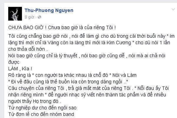 Vòng vo một hồi, giọng ca “ Như chưa bắt đầu” nói thẳng vào vụ việc ca sĩ Tuấn Hưng tố cô “hát chui”, cô chia sẻ: “Câu chuyện của riêng Tôi , trả giá mất mát của riêng tôi. Nỗi đau ấy tôi nhận riêng mình để người nhạc sỹ viết nên thành tác phẩm và để nhiều người thấy họ trong đó. Từ nghiệp dư cho đến ngôi sao. Từ đơn lẻ cho đến nhóm band. Từ ngồi hát vui cho đến kinh doanh kiếm tiền. Từ mới hôm qua xuất hiện cho đến vừa chia tay cõi đời Họ hát Chưa Bao Giờ ! Tôi thấy hạnh phúc.