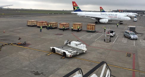 | Các thùng chở thú chuyên dụng đang được đưa lên chuyến chuyên cơ thứ 7 - xuất phát từ Nam Phi lúc 15h ngày 16/12 |
