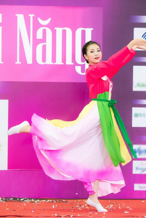 Bùi Nữ Kiều Vỹ duyên dáng trong áo tứ thân, trình diễn điệu múa dân gian trên sân khấu.