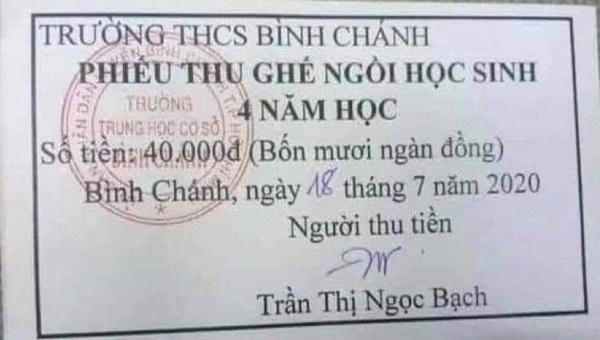 Trước đó, nhiều phụ huynh trường THCS Bình Chánh xôn xao về phiếu thu ghế ngồi học sinh, được lập ngày 18/7, có đóng dấu, kèm số tiền phải đóng trong 4 năm học là 40.000 đồng/cháu.