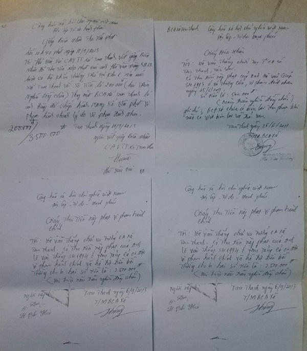 Cụ thể, ngày 6/9/2013, Trưởng Công an xã Tam Thanh – ông Hà Văn Thắng viết “Giấy thu tiền nộp phạt vi phạm hành chính” với nội dung: “Tôi: Hà Văn Thắng, chức vụ Trưởng Công an xã Tam Thanh có thu tiền nộp phạt của anh Lê Văn Thắng (SN 1994) ở xóm Tảng cả 2 đợt vi phạm hành chính và số tiền đền bù cho bị hại số tiền là 2 triệu 500 nghìn đồng”; “Giấy biên nhận” ngày 26/6/2011, với nội dung: “Tôi Hà Văn Thắng, chức vụ Trưởng Công an xã Tam Thanh có thu tiền nộp phạt của anh Hà Văn Giáp (SN 1993) ở xã Thượng Cửu, vi phạm đánh nhau ngày 25/6/2011 số tiền là 500 nghìn đồng”…