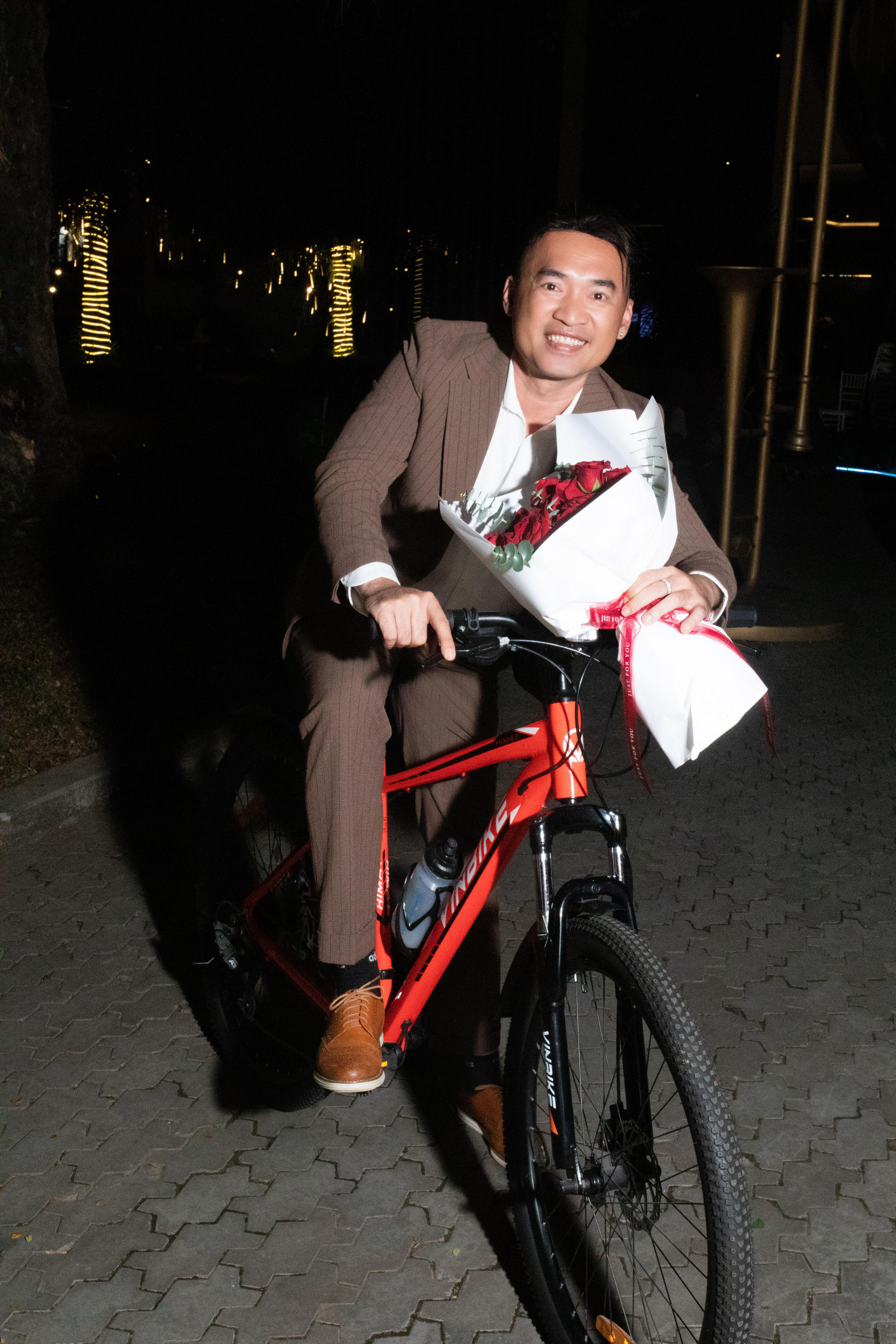 Tiến Luật gây bất ngờ khi đạp xe đến chúc mừng cho dự án điện ảnh đầu tay do vợ làm đạo diễn. Anh được tiết lộ là một nhân tố quan trọng trong phim. Ảnh: NSX |
