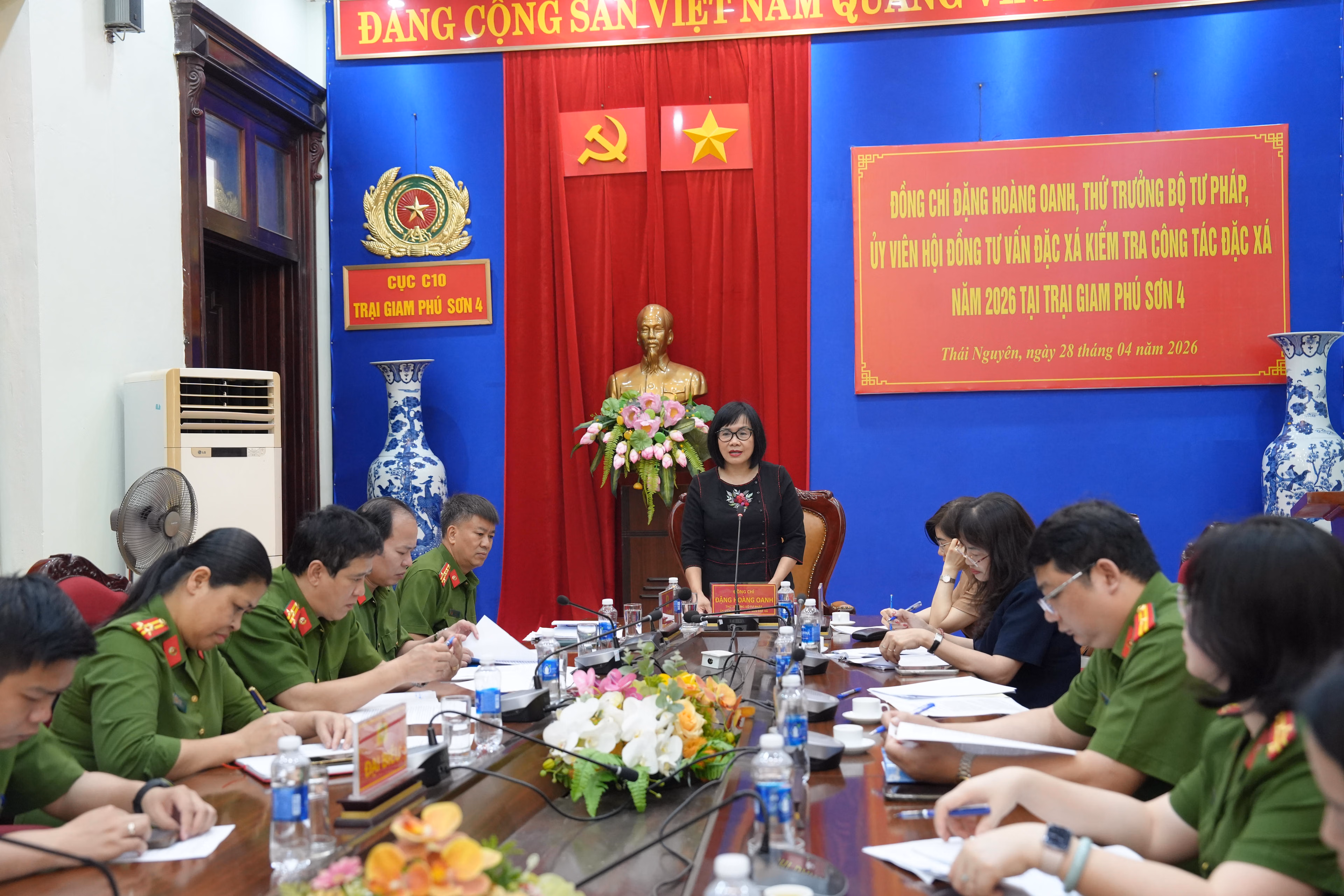 Ngày 28/4, Đoàn công tác do Thứ trưởng Bộ Tư pháp Đặng Hoàng Oanh, Thành viên Hội đồng tư vấn đặc xá làm Trưởng đoàn đã đi kiểm tra công tác đặc xá năm 2026 tại Trại giam Phú Sơn 4.