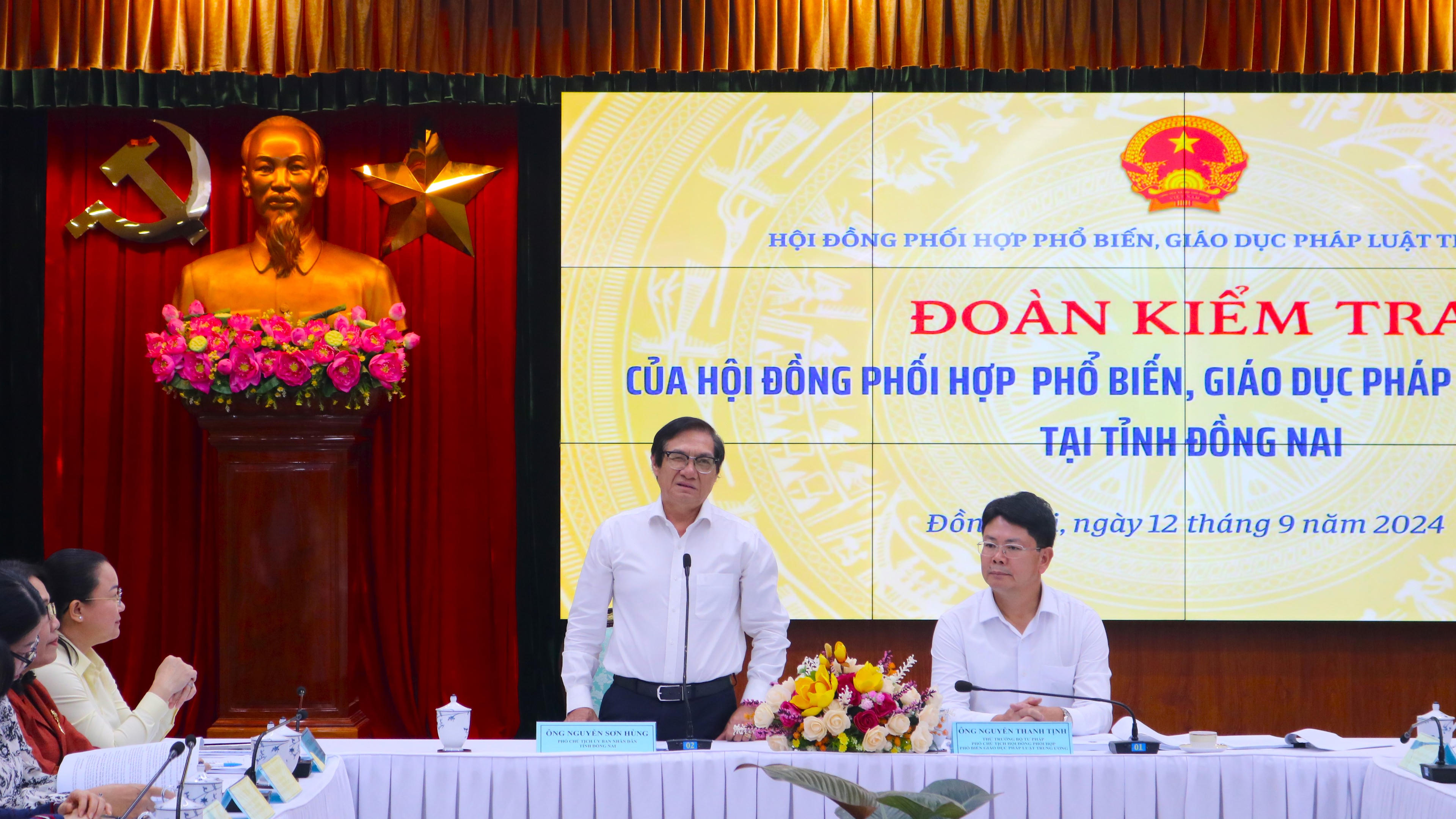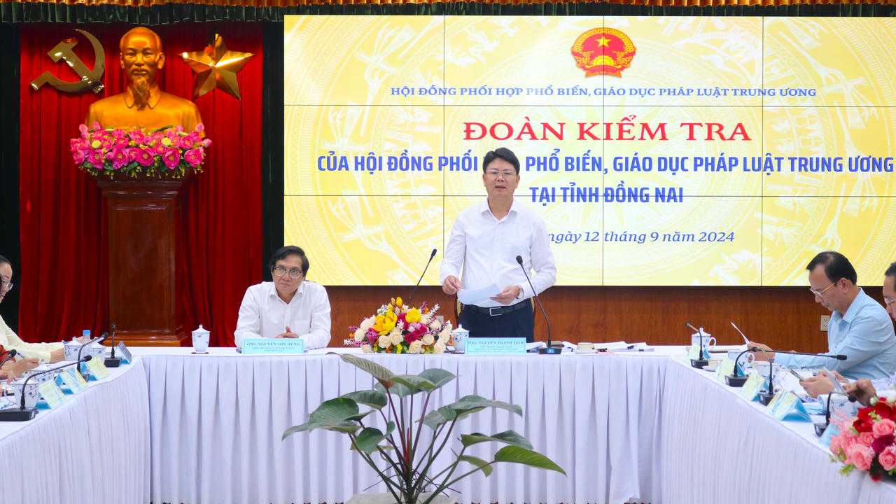 (PLVN) - Tiếp tục chương trình làm việc của Đoàn kiểm tra của Hội đồng phối hợp phổ biến giáo dục pháp luật (PBGDPL) Trung ương, chiều 12/9/2024, Đoàn đã có buổi làm việc với tỉnh Đồng Nai do Thứ trưởng Bộ Tư pháp Nguyễn Thanh Tịnh – Phó Chủ tịch Hội đồng phối hợp PBGDPL Trung ương làm trưởng đoàn.