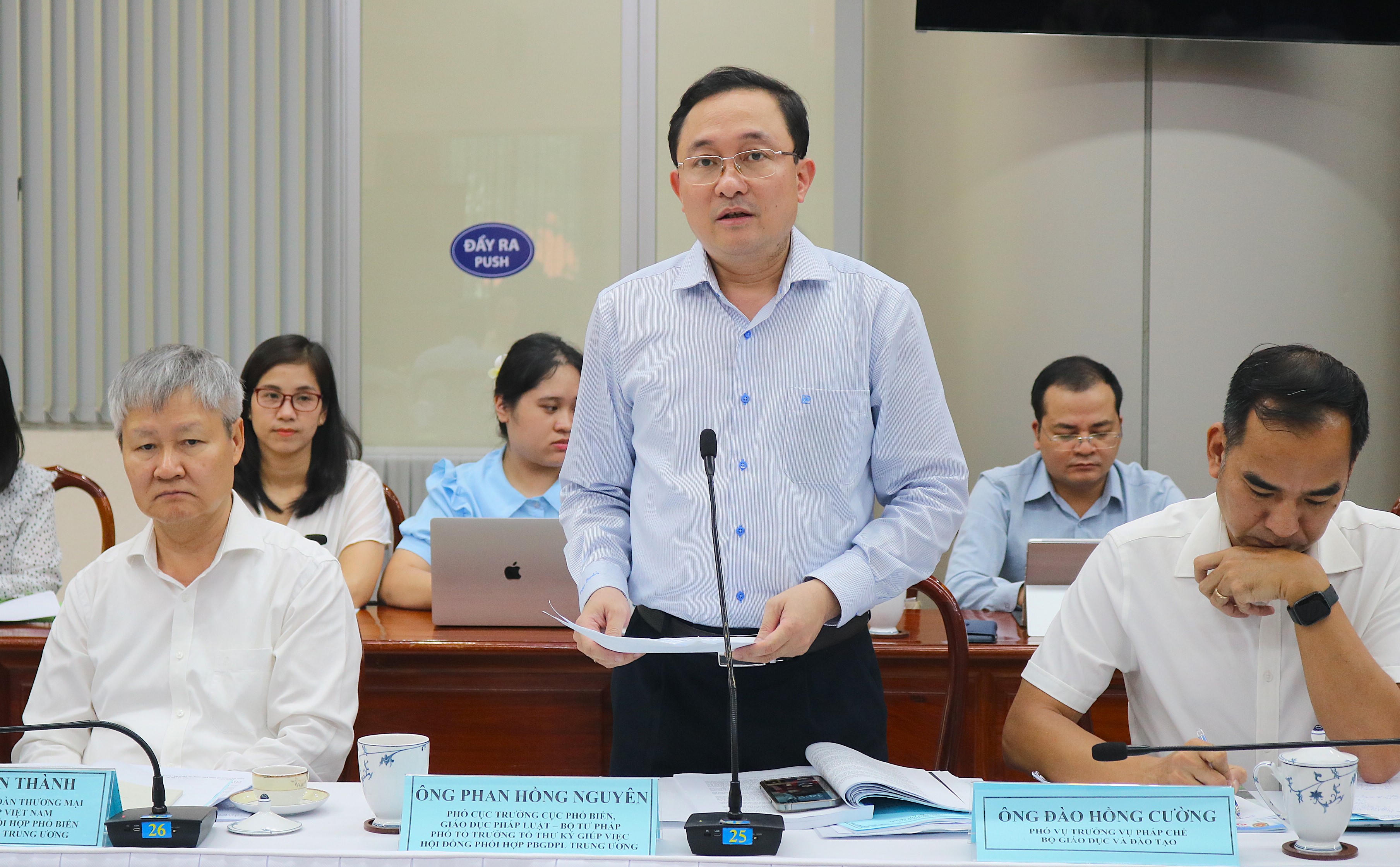 Ông Phan Hồng Nguyên – Phó Cục trưởng Cục PBGDPL, Bộ Tư pháp báo cáo kết quả kiểm tra tại huyện Thống Nhất (tỉnh Đồng Nai) sáng cùng ngày. |