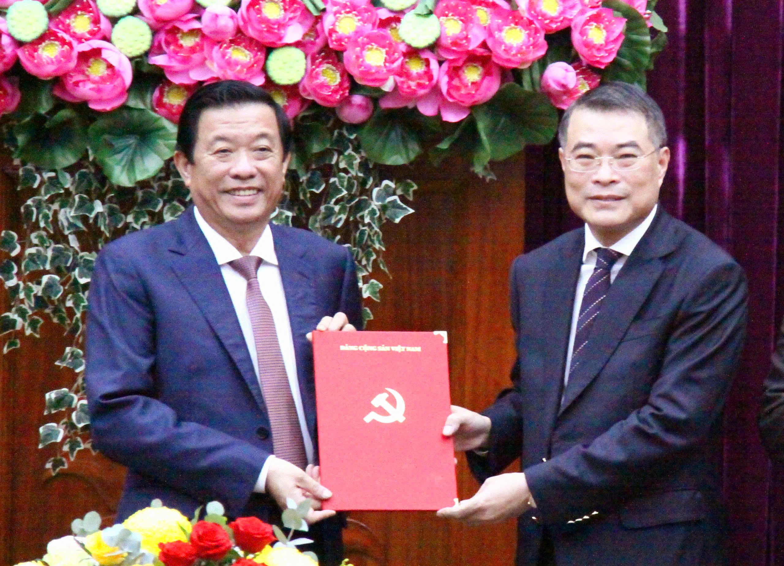| Đồng chí Lê Minh Hưng trao quyết định cho tân Bí thư Tỉnh ủy Vĩnh Long Trần Tiến Dũng |