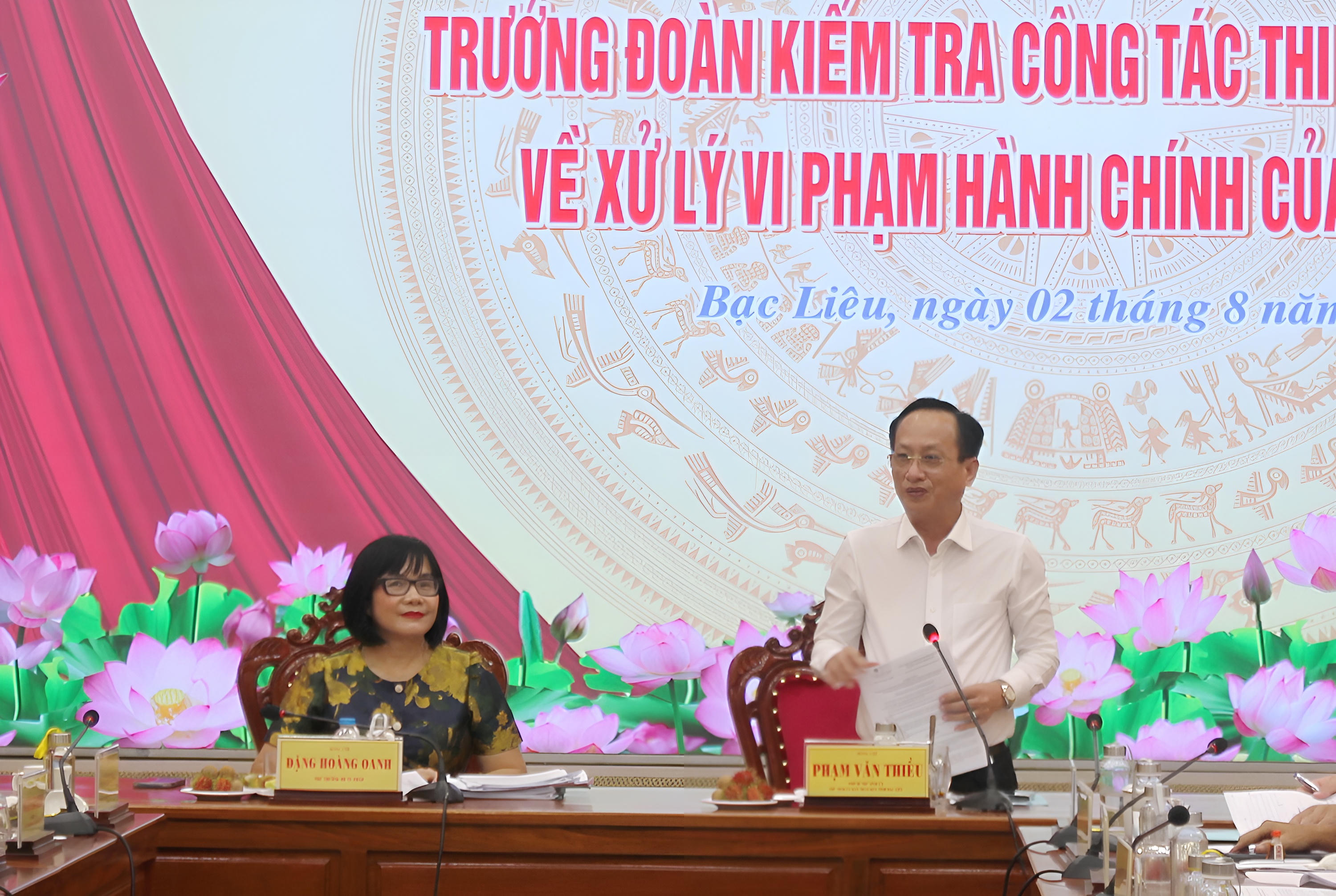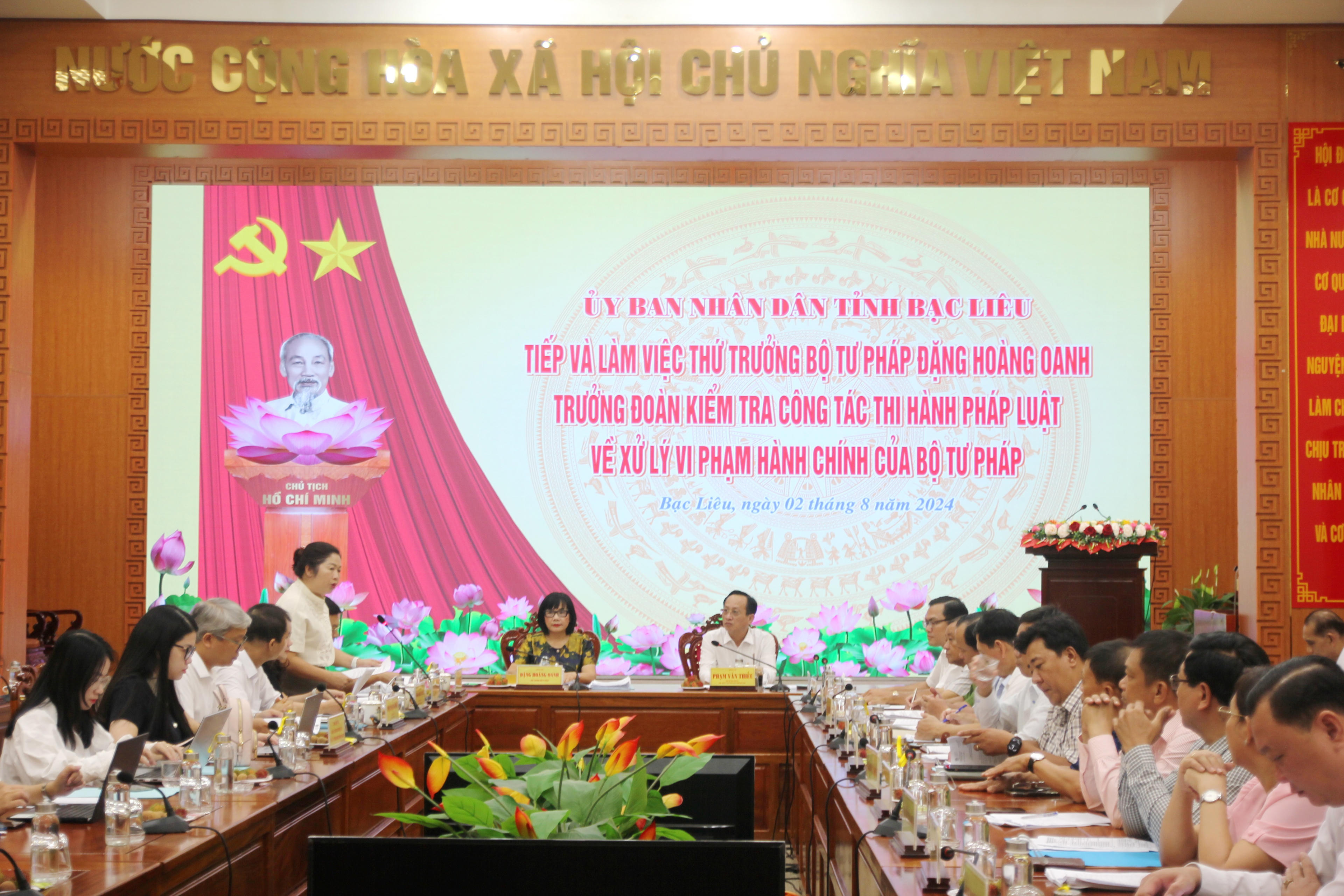Sau khi các thành viên trong Đoàn kiểm tra và đại diện các Sở, ngành, địa phương phát biểu ý kiến, phát biểu kết luận cuộc họp, Thứ trưởng Bộ Tư pháp Đặng Hoàng Oanh đề nghị lãnh đạo tỉnh Bạc Liêu cần tăng cường hơn nữa công tác chỉ đạo, điều hành, trong đó lưu ý tập trung vào công tác chỉ đạo, triển khai thực hiện các quy định pháp luật về quản lý công tác thi hành pháp luật về xử lý vi phạm hành chính.