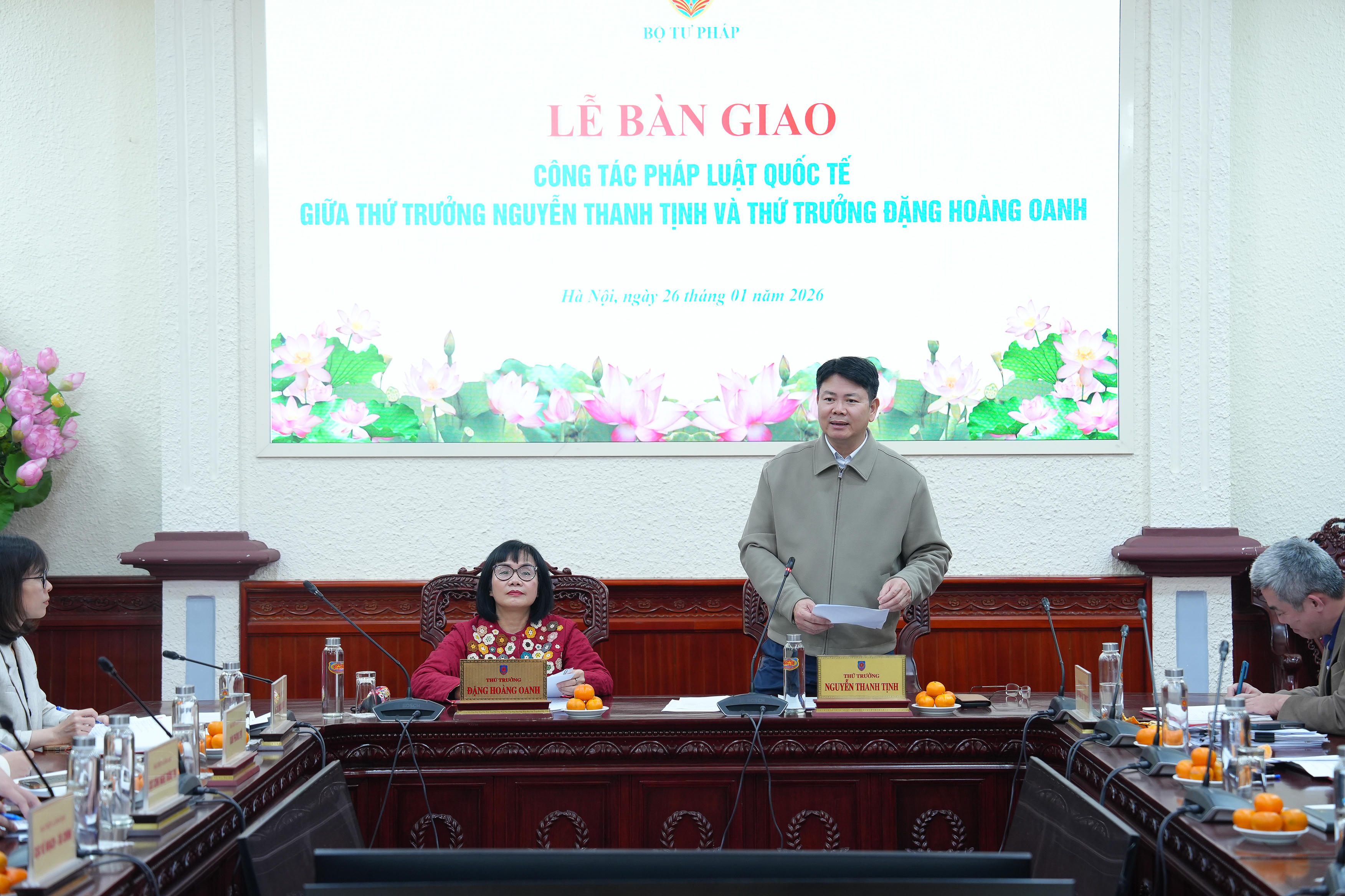 Phát biểu tại buổi bàn giao, Thứ trưởng Nguyễn Thanh Tịnh điểm lại những kết quả nổi bật thời gian qua của Vụ Pháp luật quốc tế. Theo Thứ trưởng, trong điều kiện biên chế còn mỏng, khối lượng công việc lớn, yêu cầu cao về tiến độ và chất lượng, Vụ đã thể hiện bản lĩnh, tinh thần trách nhiệm và sự chuyên nghiệp, giữ vững hình ảnh, uy tín của Việt Nam trên các diễn đàn pháp lý quốc tế.