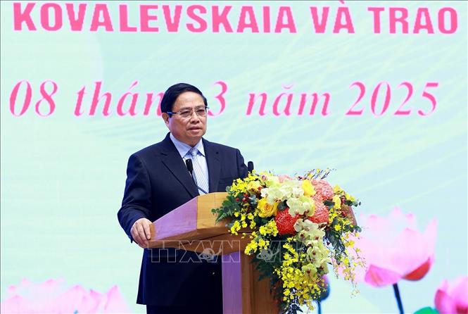 Thủ tướng Phạm Minh Chính phát biểu chúc mừng các nữ Anh hùng lực lượng vũ trang nhân dân, nữ Anh hùng lao động, nữ tướng, nhà khoa học nữ nhận Giải thưởng Kovalevskaia. Ảnh: Dương Giang/TTXVN