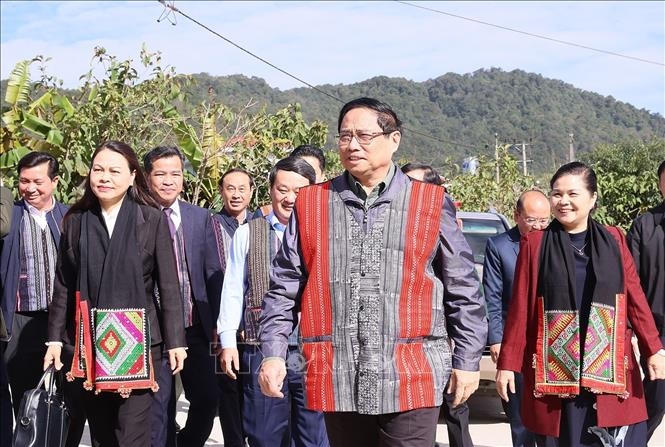 Thủ tướng Phạm Minh Chính cùng các đại biểu đến dự Ngày hội Đại đoàn kết toàn dân tộc tại huyện Sìn Hồ, Lai Châu. (ảnh: TTXVN) |