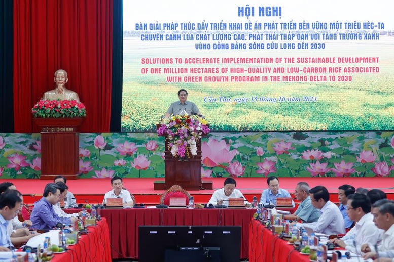 Chiều ngày 15/10, tại Cần Thơ, Thủ tướng Phạm Minh Chính dự Hội nghị triển khai Đề án "Phát triển bền vững một triệu héc-ta chuyên canh lúa chất lượng cao và phát thải thấp gắn với với tăng trưởng xanh vùng ĐBSCL đến năm 2030".