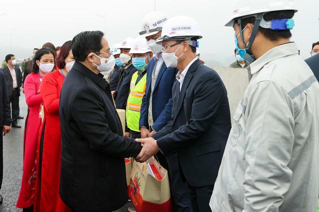 Cũng nhân dịp này, trên đường đi thông tuyến kỹ thuật tuyến cao tốc Vân Đồn - Móng Cái, Thủ tướng đã thăm, chúc Tết, tặng quà cán bộ, công nhân đang thi công tuyến đường.