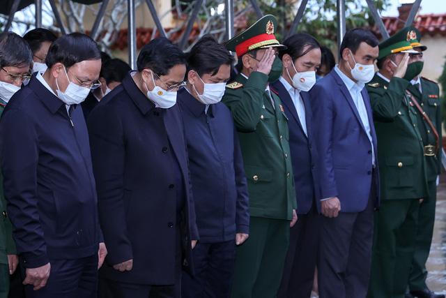Thủ tướng Phạm Minh Chính cùng Đoàn công tác tưởng niệm các Anh hùng, liệt sĩ tại Pò Hèn, thành phố Hải Sơn, Móng Cái. Ảnh VGP/Nhật Bắc