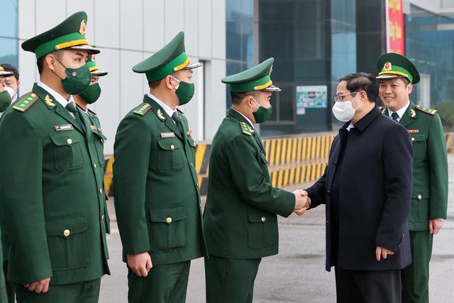 Thủ tướng thăm, chúc Tết các lực lượng chức năng đang làm việc tại cửa khẩu quốc tế Móng Cái. Ảnh: VGP/Nhật Bắc