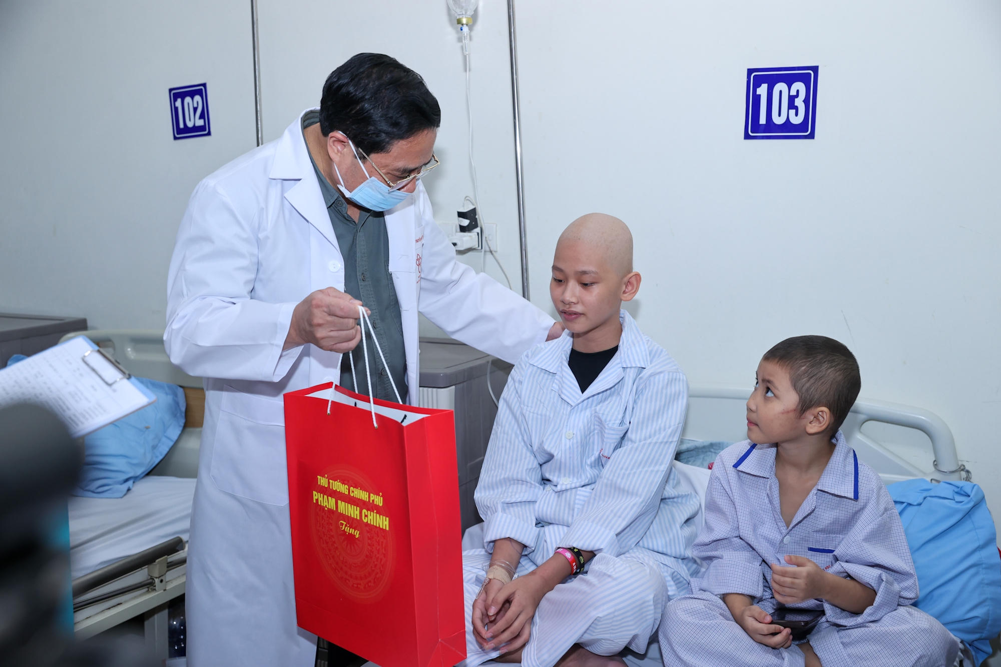 Thủ tướng chúc các cháu thiếu nhi đón Tết Trung thu vui vẻ, luôn yêu đời, hướng tới tương lai, kiên trì điều trị để sớm khỏi bệnh và trở về với gia đình, lớp học của mình - Ảnh: VGP/Nhật Bắc