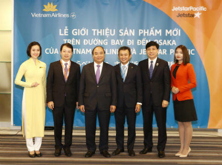 (PLO) - Ngày 7/6, tại Osaka (Nhật Bản), Vietnam Airlines và Jetstar Pacific Airlines đã tổ chức Lễ giới thiệu sản phẩm mới trên đường bay đi/đến Osaka của 2 hãng, dưới sự hiện diện của Thủ tướng Nguyễn Xuân Phúc, cùng hơn 100 khách mời là đại diện lãnh đạo các Bộ ngành, Lãnh sự quán Việt Nam, các đối tác và các cơ quan thông tấn lớn của Việt Nam và Nhật Bản.