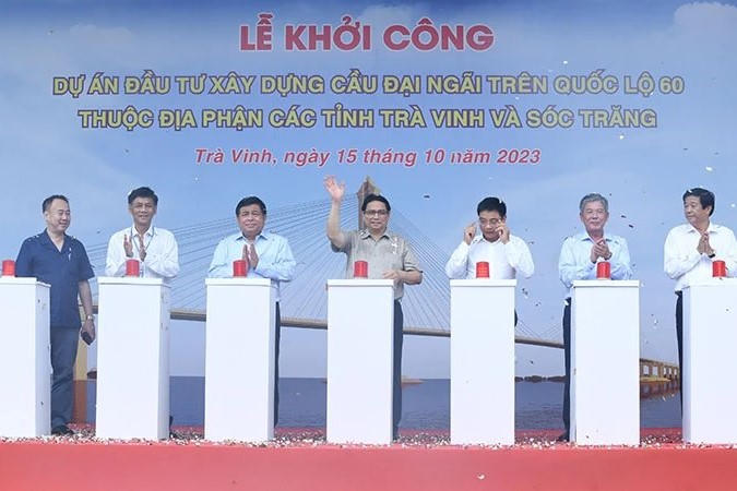 (PLVN) - Sáng 15/10, lễ khởi công dự án đầu tư xây dựng cầu Đại Ngãi trên Quốc lộ 60 diễn ra tại huyện Tiểu Cần, tỉnh Trà Vinh. Thủ tướng Phạm Minh Chính trực tiếp dự và phát biểu tuyên bố khởi công dự án.