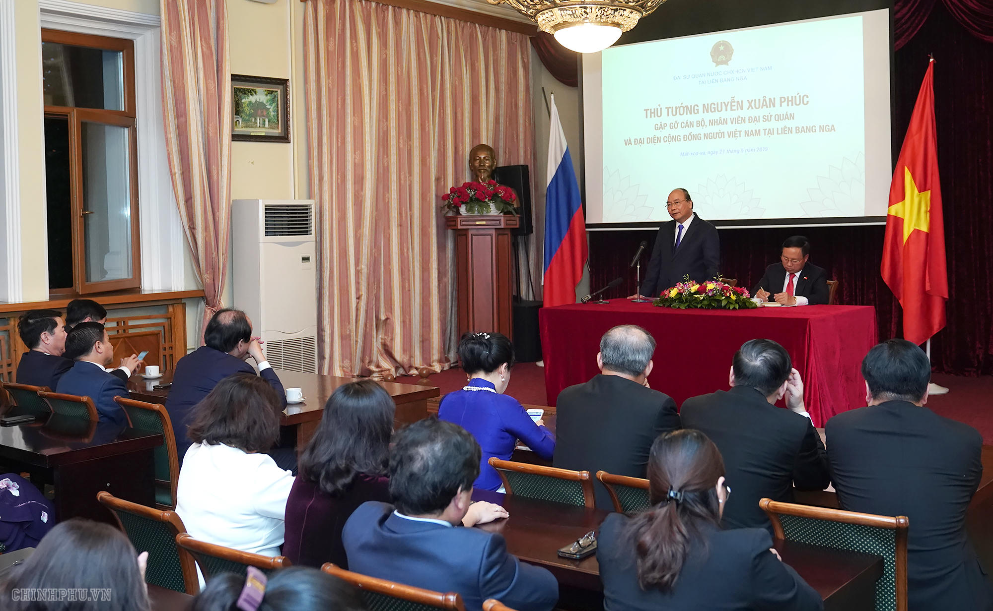Buổi tối cùng ngày, giờ địa phương (rạng sáng 22/5, giờ Việt Nam), Thủ tướng Nguyễn Xuân Phúc đã đến thăm, nói chuyện với cán bộ, nhân viên Đại sứ quán và cộng đồng người Việt Nam tại Nga.
