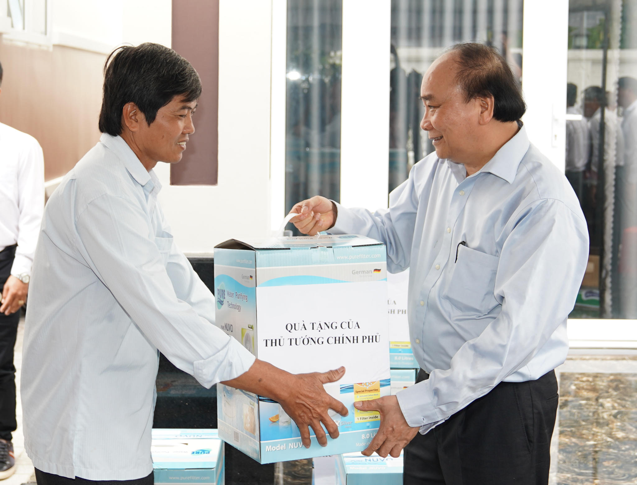 Thủ tướng tặng máy lọc nước cho nông dân trồng sầu riêng tại xã Hiệp Đức, huyện Cai Lậy, Tiền Giang - Ảnh: VGP/Quang Hiếu |