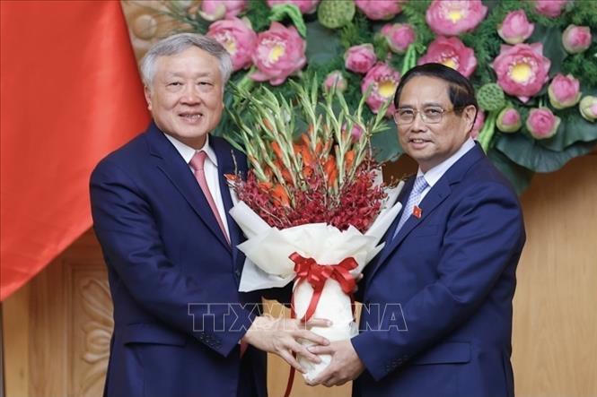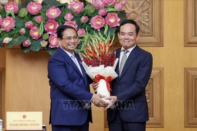 Thủ tướng Phạm Minh Chính tặng hoa chúc mừng Phó Thủ tướng Trần Lưu Quang được Bộ Chính trị điều động, phân công giữ chức Trưởng Ban Kinh tế Trung ương. Ảnh: Dương Giang/TTXVN