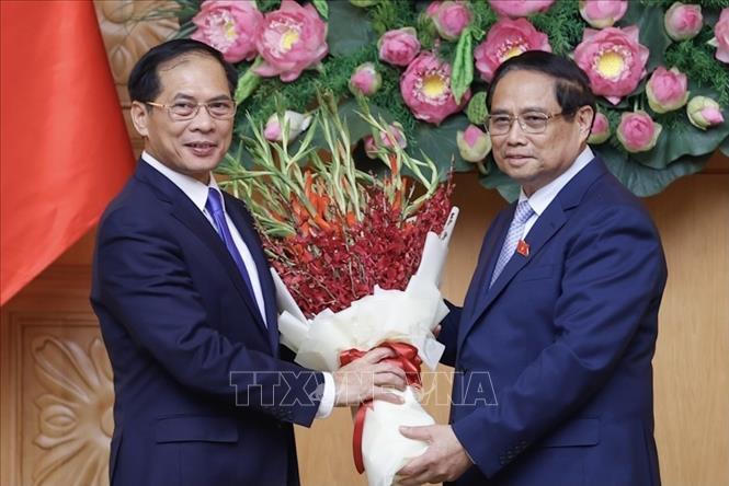 Thủ tướng Phạm Minh Chính tặng hoa chúc mừng tân Phó Thủ tướng, Bộ trưởng Bộ Ngoại giao Bùi Thanh Sơn. Ảnh: Dương Giang/TTXVN