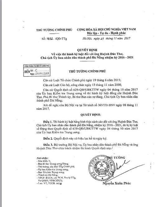 (PLO) - Ngày 21/11, Thủ tướng Nguyễn Xuân Phúc ký quyết định thi hành kỷ luật bằng hình thức cảnh cáo đối với ông Huỳnh Đức Thơ, Chủ tịch UBND TP Đà Nẵng nhiệm kỳ 2016-2021